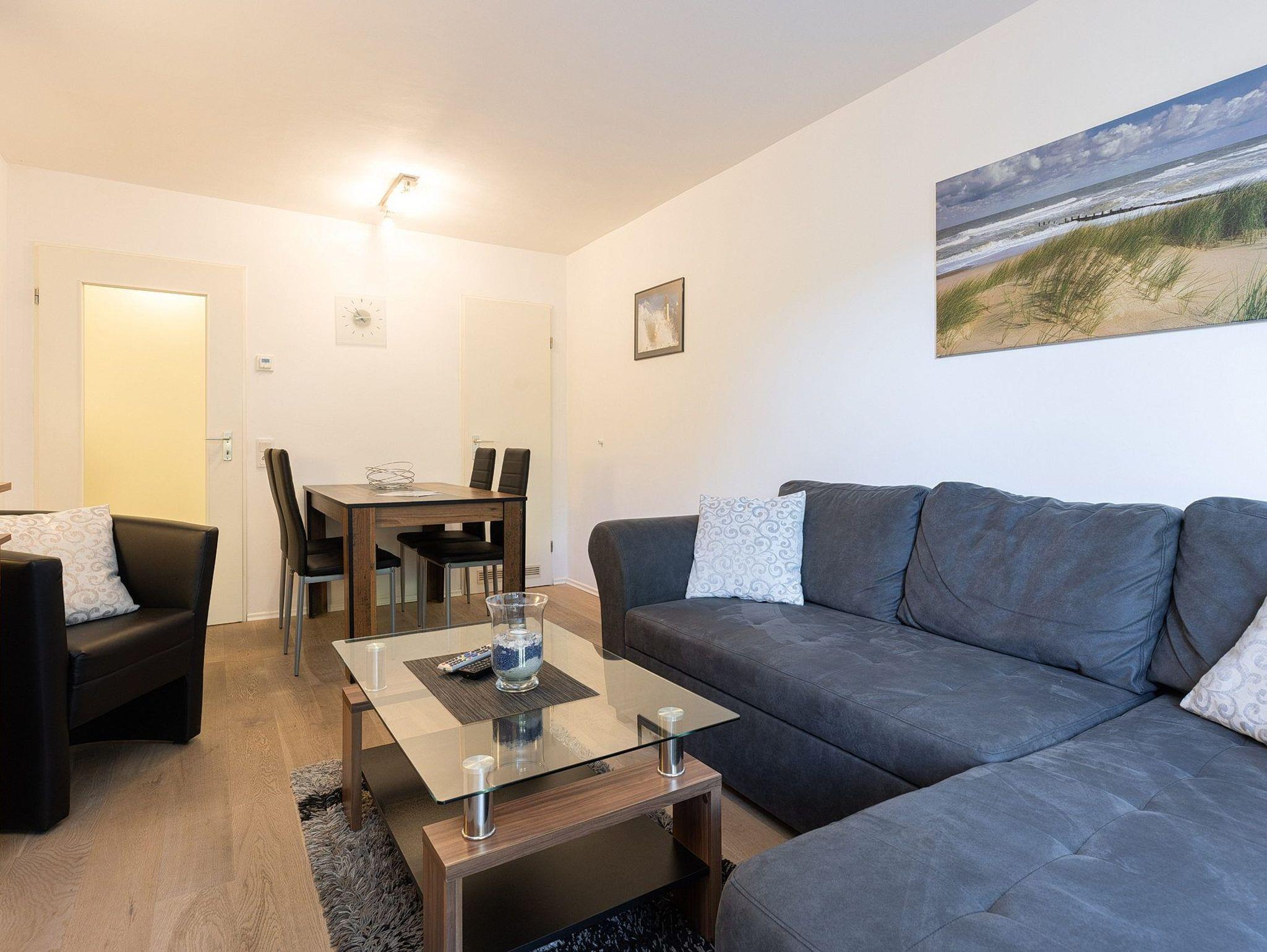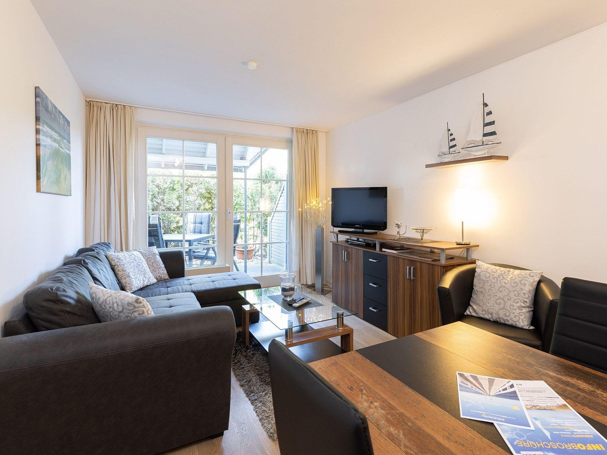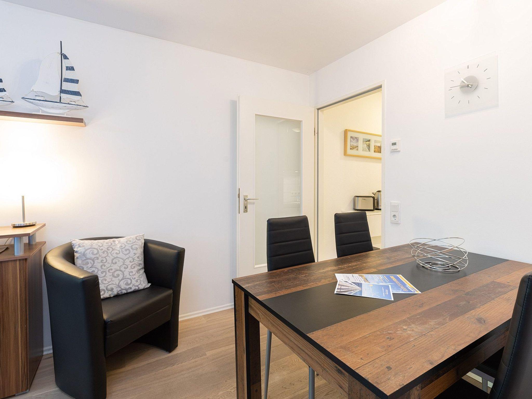 Modernes und Ende 2021 renoviertes Wohn- und Esszimmer im EG mit direktem Zugang zur Terrasse. Das Wohn- und Esszimmer ist mit einem Essplatz für 4 Personen, einer Eck-Couch, 1 Sessel, einem Couchtisch und einer Kommode ausgestattet. Zur Unterhaltung steht ein Flachbildschirm (digitaler SAT-TV und Radioempfang) sowie ein DVD-Player zur Verfügung. Das Zimmer ist mit Laminatboden ausgelegt.