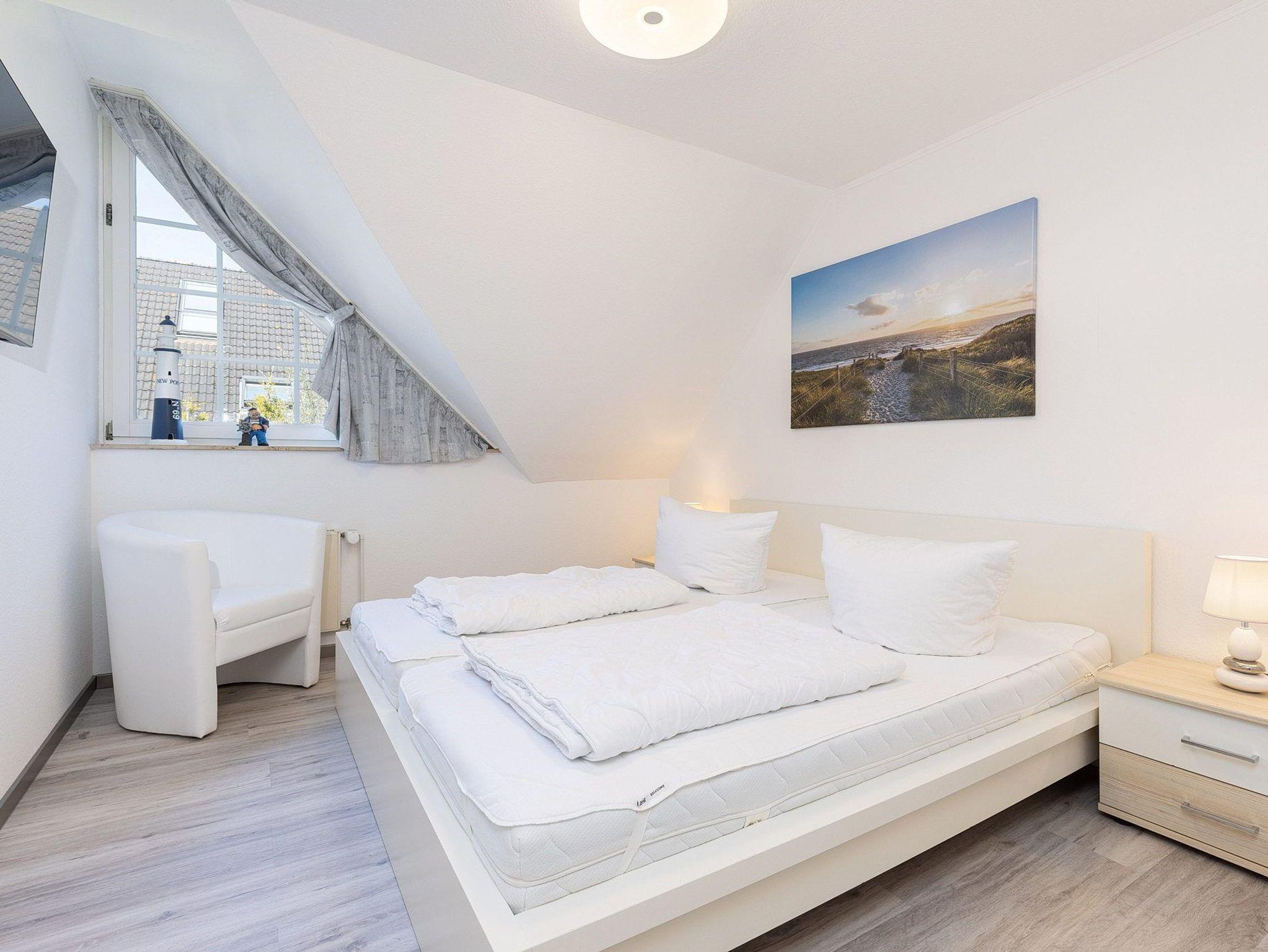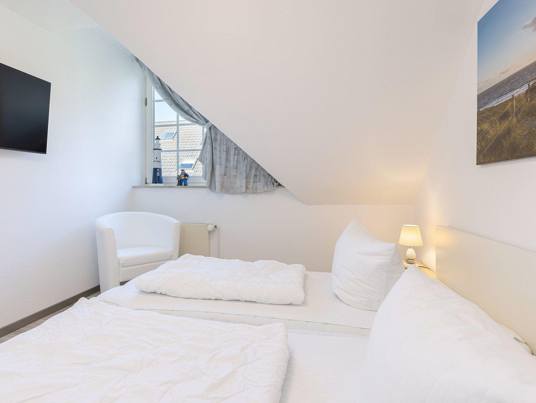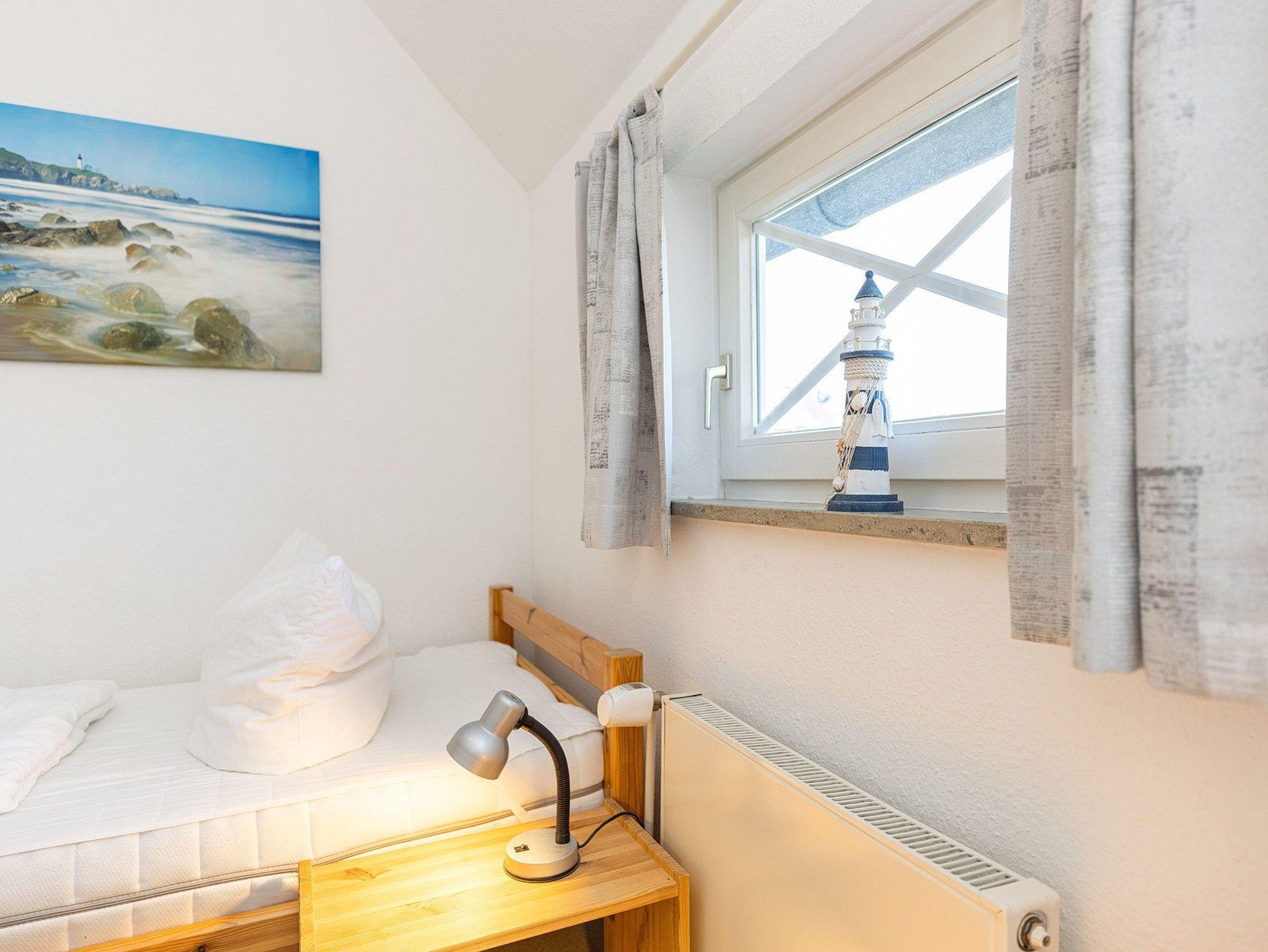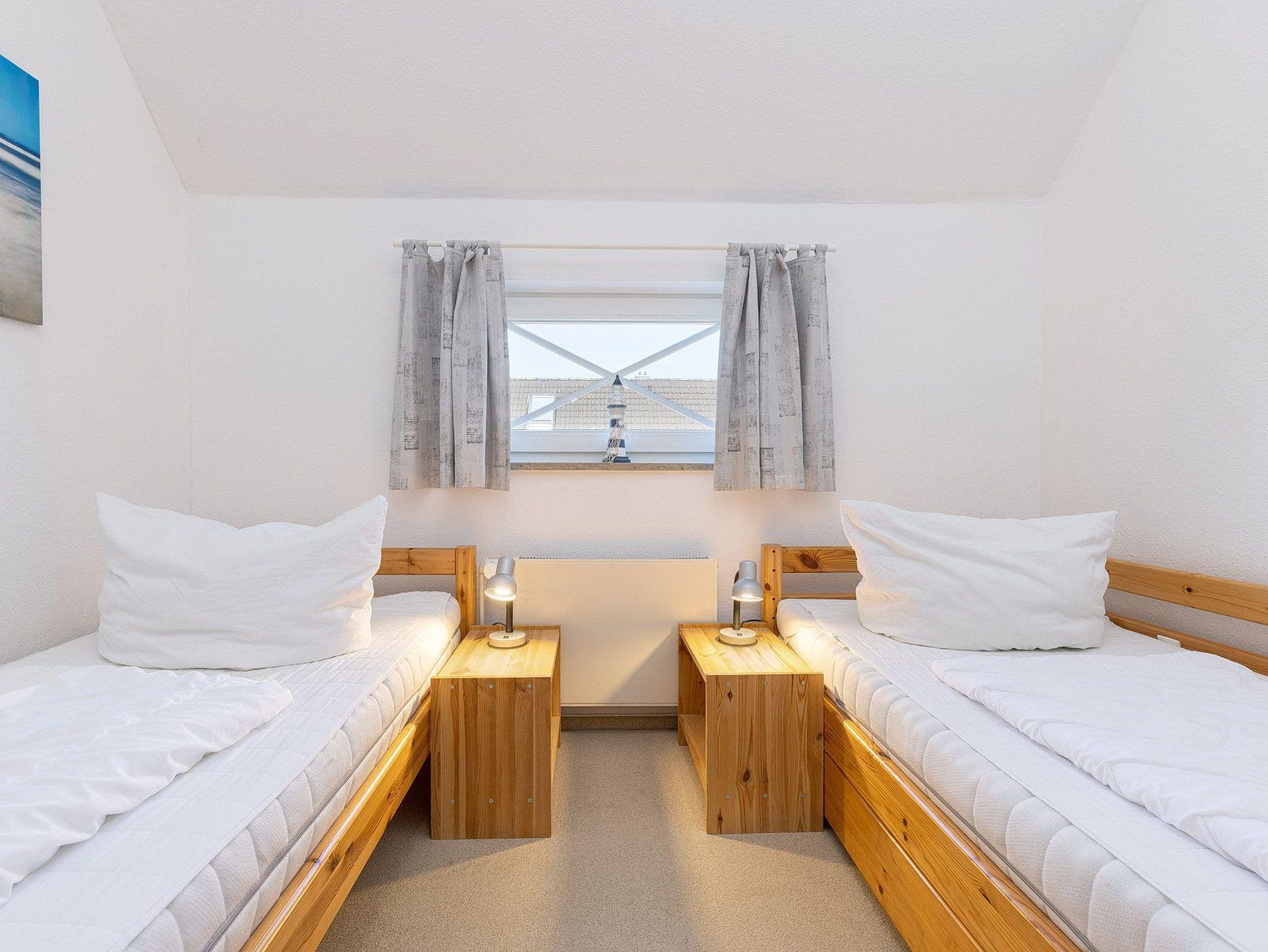 Das Schlafzimmer im 2. OG ist über eine steile und sehr geräuscharme Raumspartreppe erreichbar. Das Schlafzimmer ist mit 2 getrennten Betten (90x200cm), zwei Nachttischen, einem Kleiderschrank und einer Kommode ausgestattet. Das Zimmer ist mit Teppichboden ausgelegt. Das Fenster lässt sich durch einen blickdichten Vorhang verdunkeln.