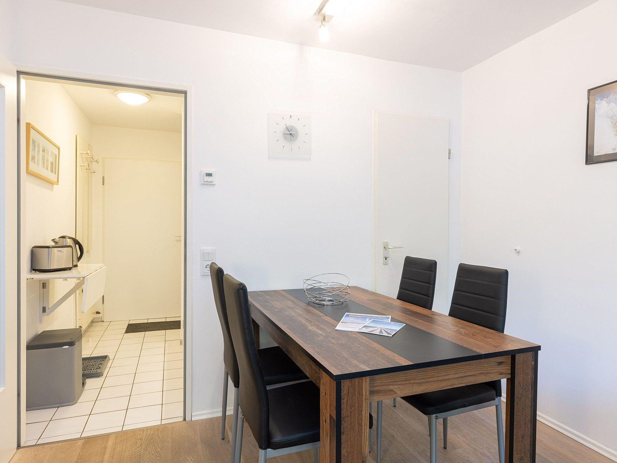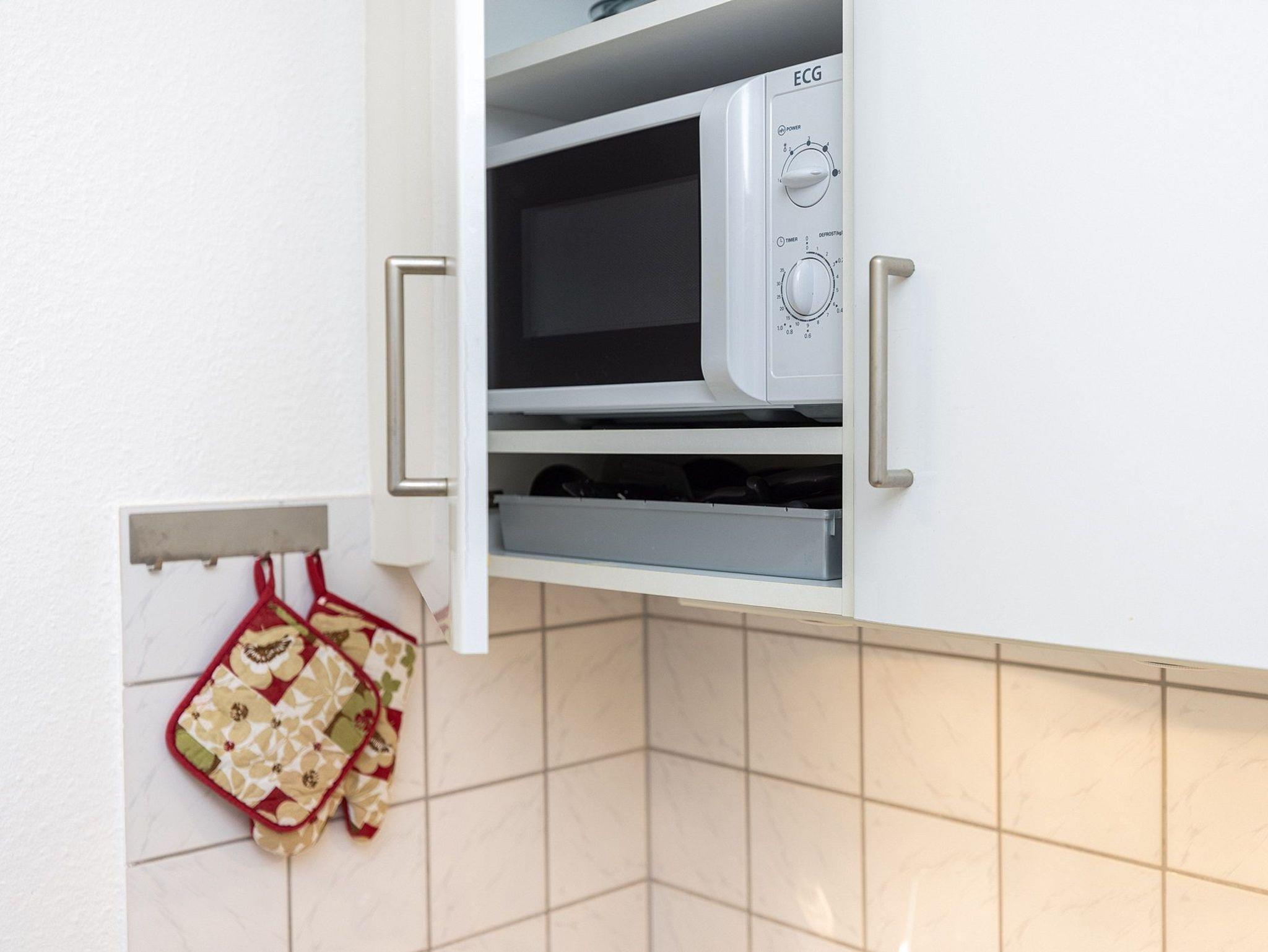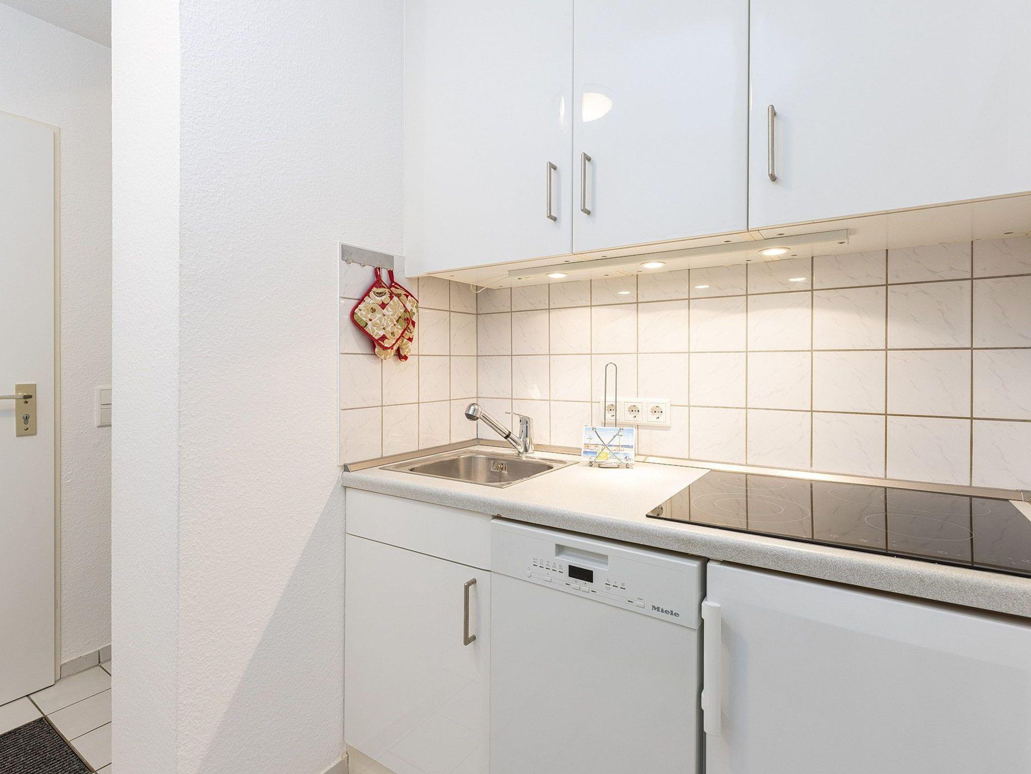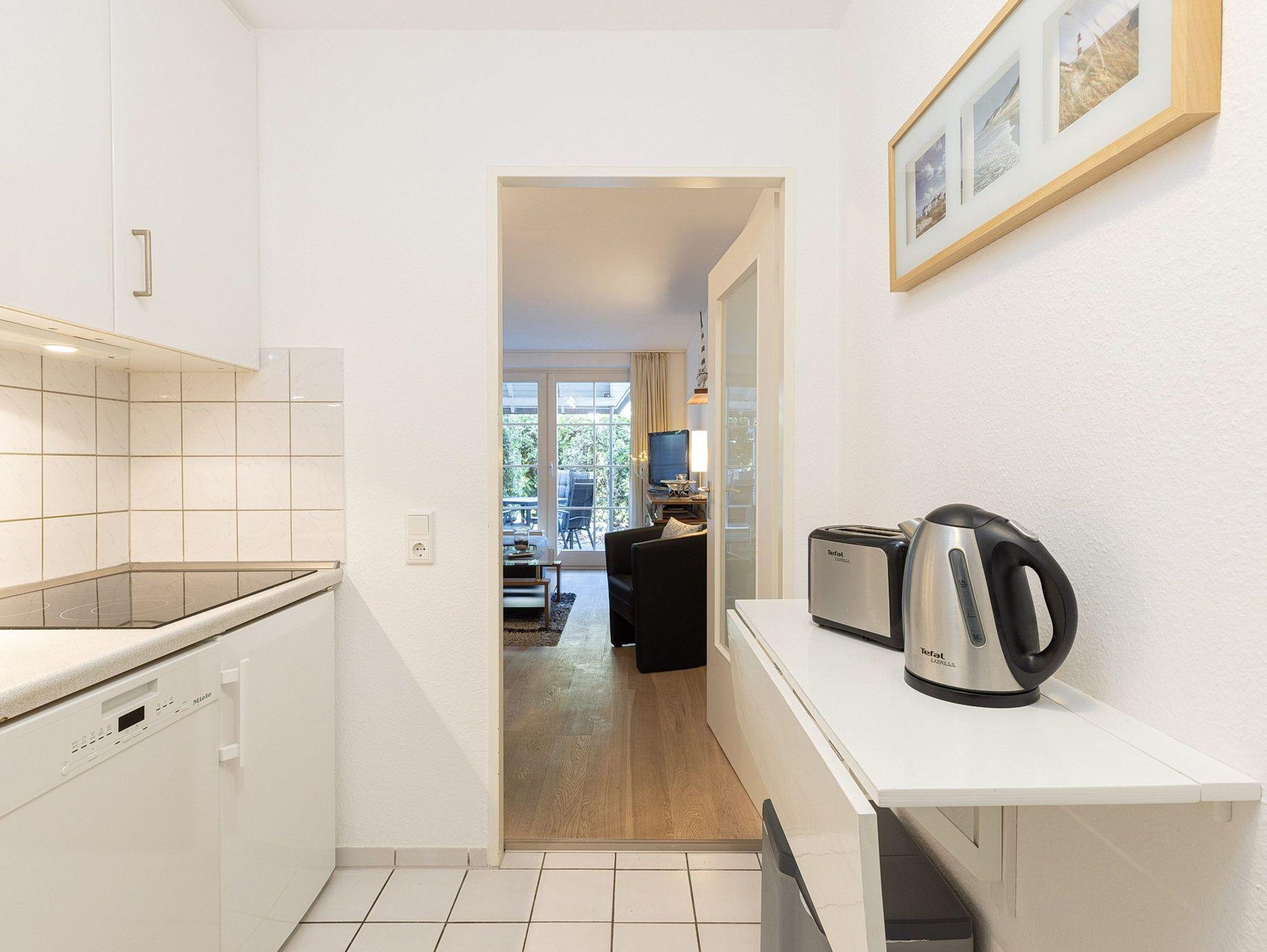 Moderne, komplett ausgestattete Pantry-Küche im EG. Die Pantry-Küche ist mit einem 4-Platten Cerankochfeld, einer Spülmaschine, einem Kühlschrank mit kleinem 3-Sterne Gefrierfach, einer Mikrowelle, einem Wasserkocher, einem Toaster und einer Kaffeemaschine ausgestattet.
