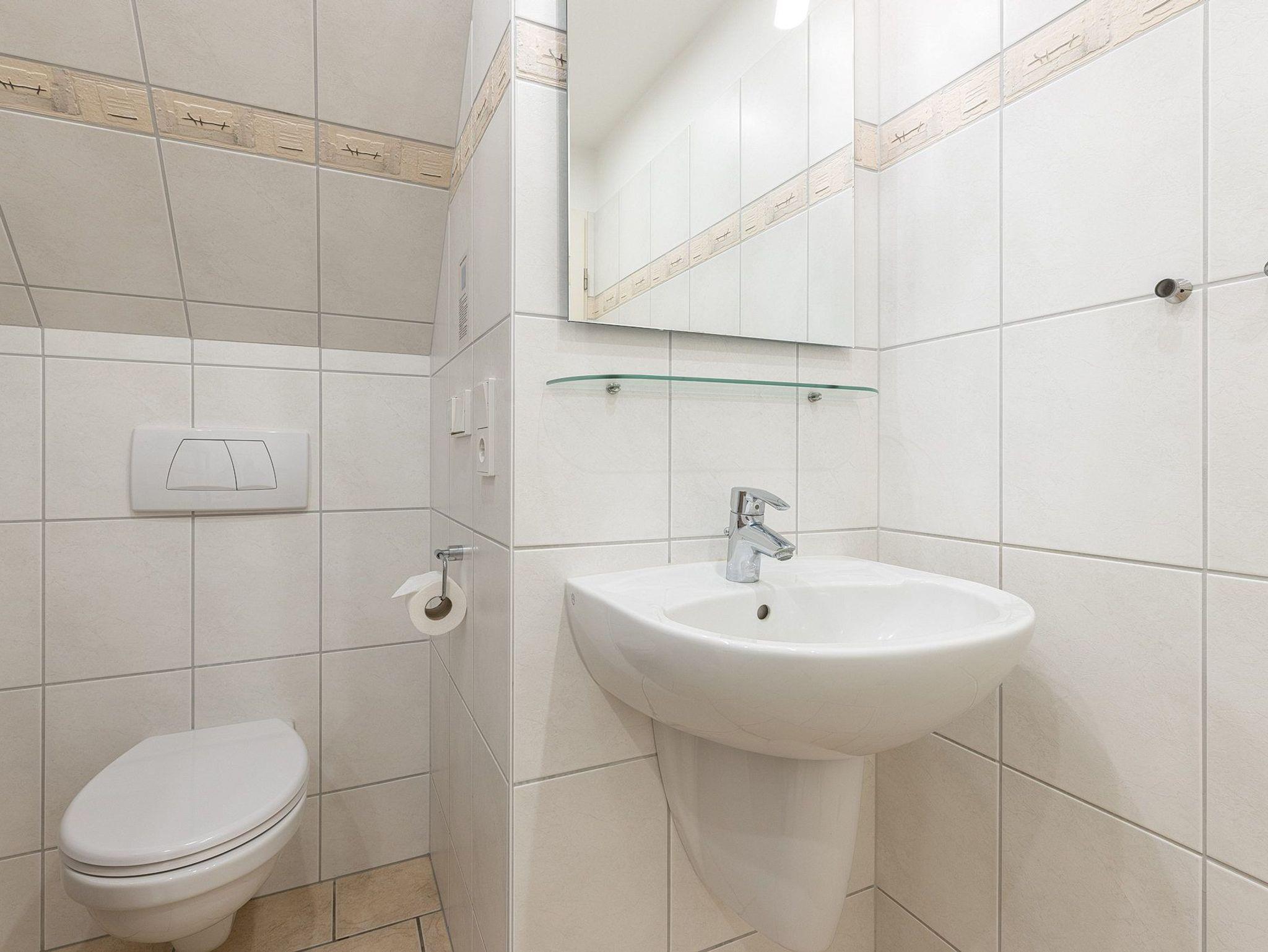 Modernes, hell gefliestes Bad im 1.OG. Das Bad ist mit einer Whirlpool-Badewanne, einem Waschbecken und einem WC ausgestattet. Die Fußbodenheizung sorgt für angenehm warme Füße.