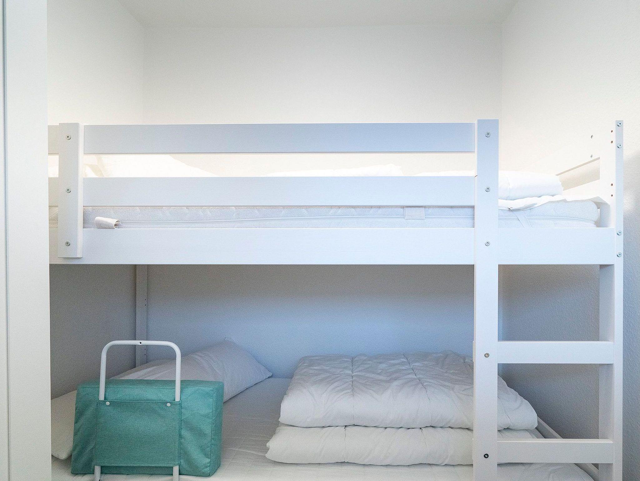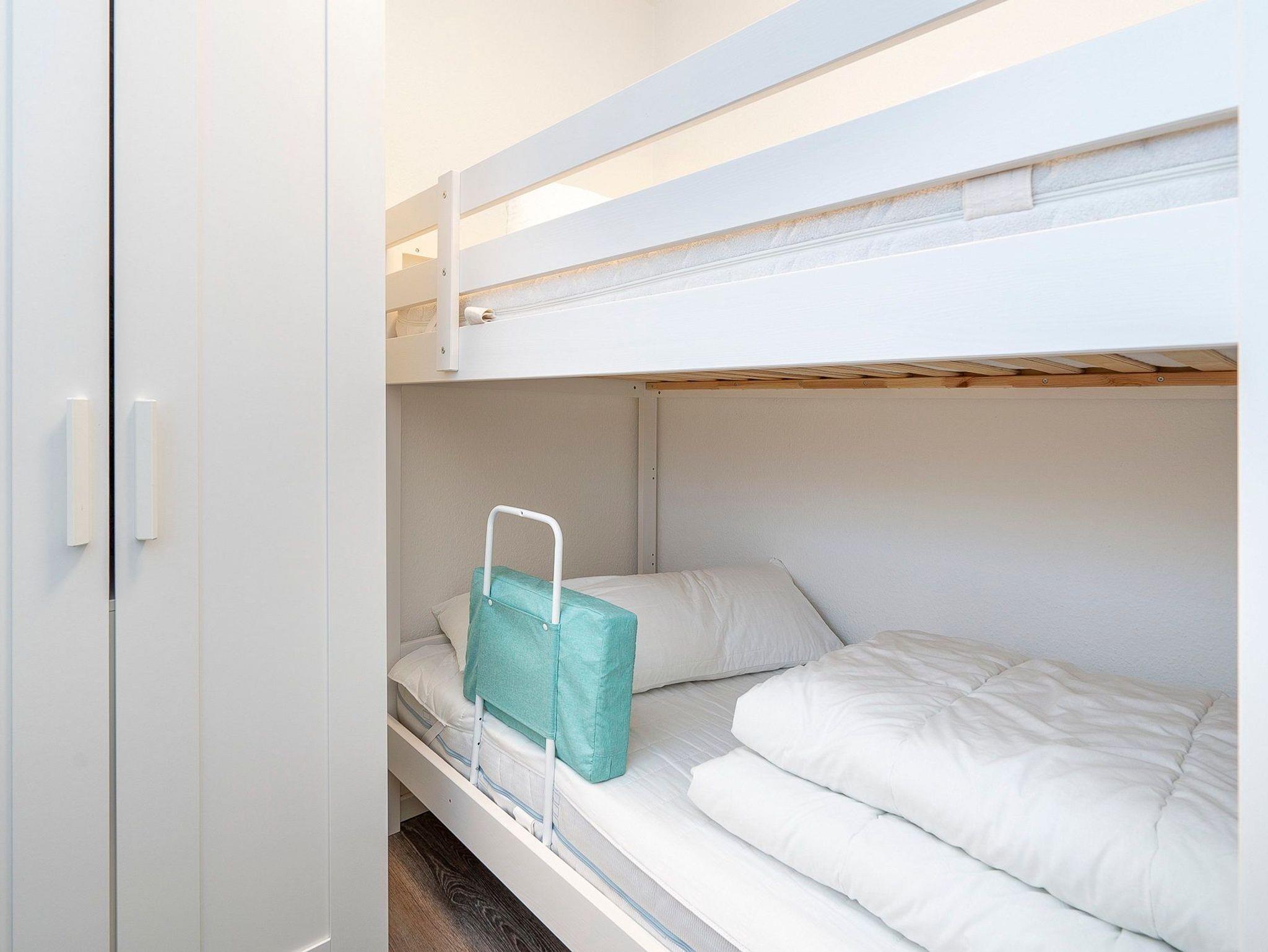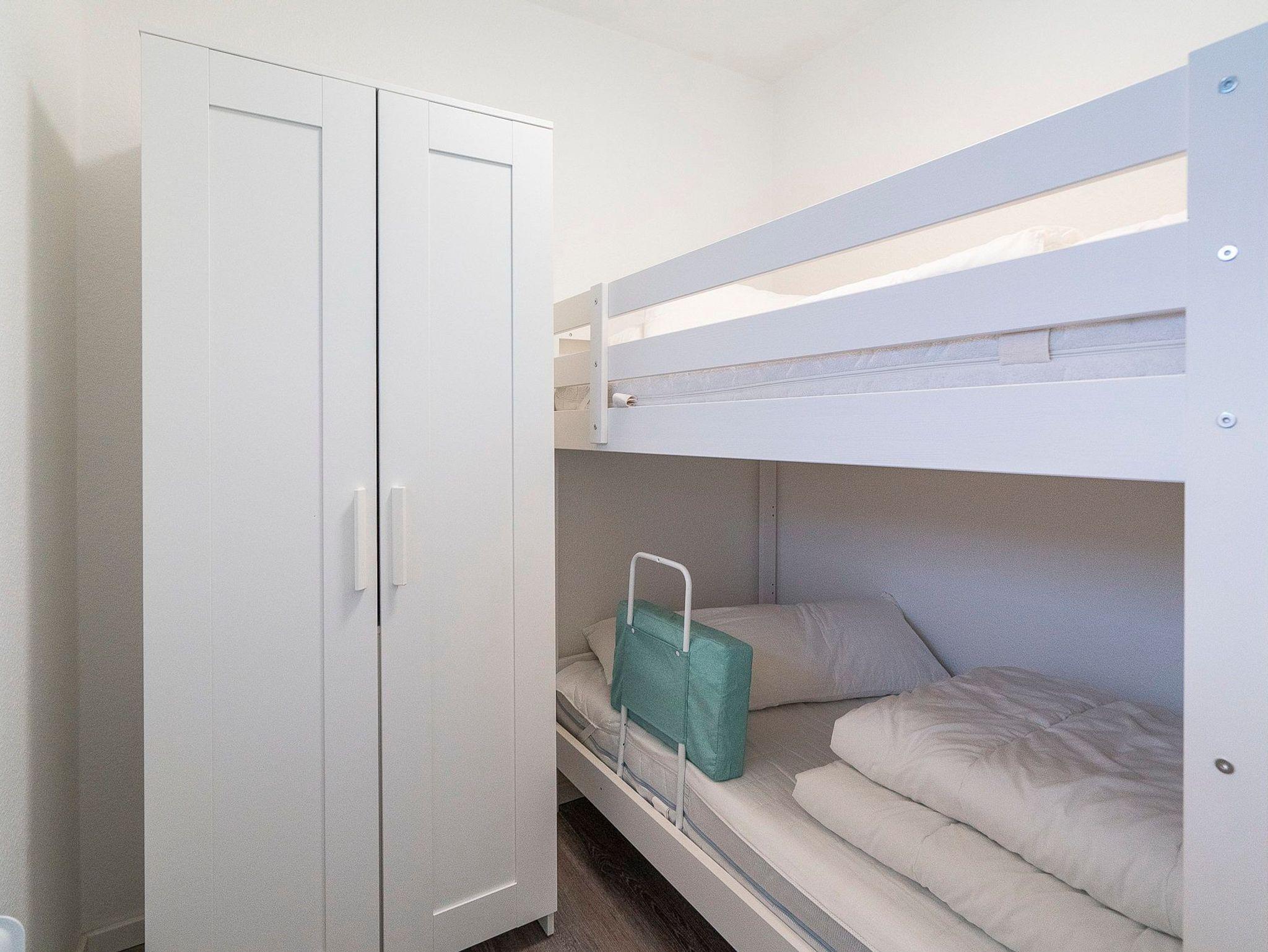 Das Kinderzimmer verfügt über ein Etagenbett (2x90x200 cm), sowie einen kleinen zweitürigen Kleiderschrank. Der Raum ist mit Vinylboden verlegt und das Fenster ist mit einem blickdichten Plissee versehen.