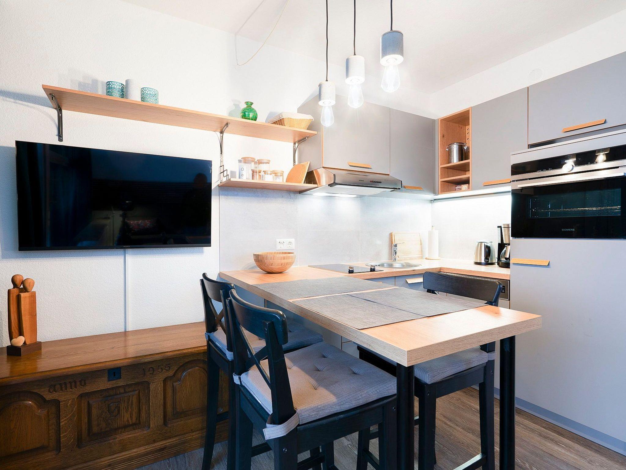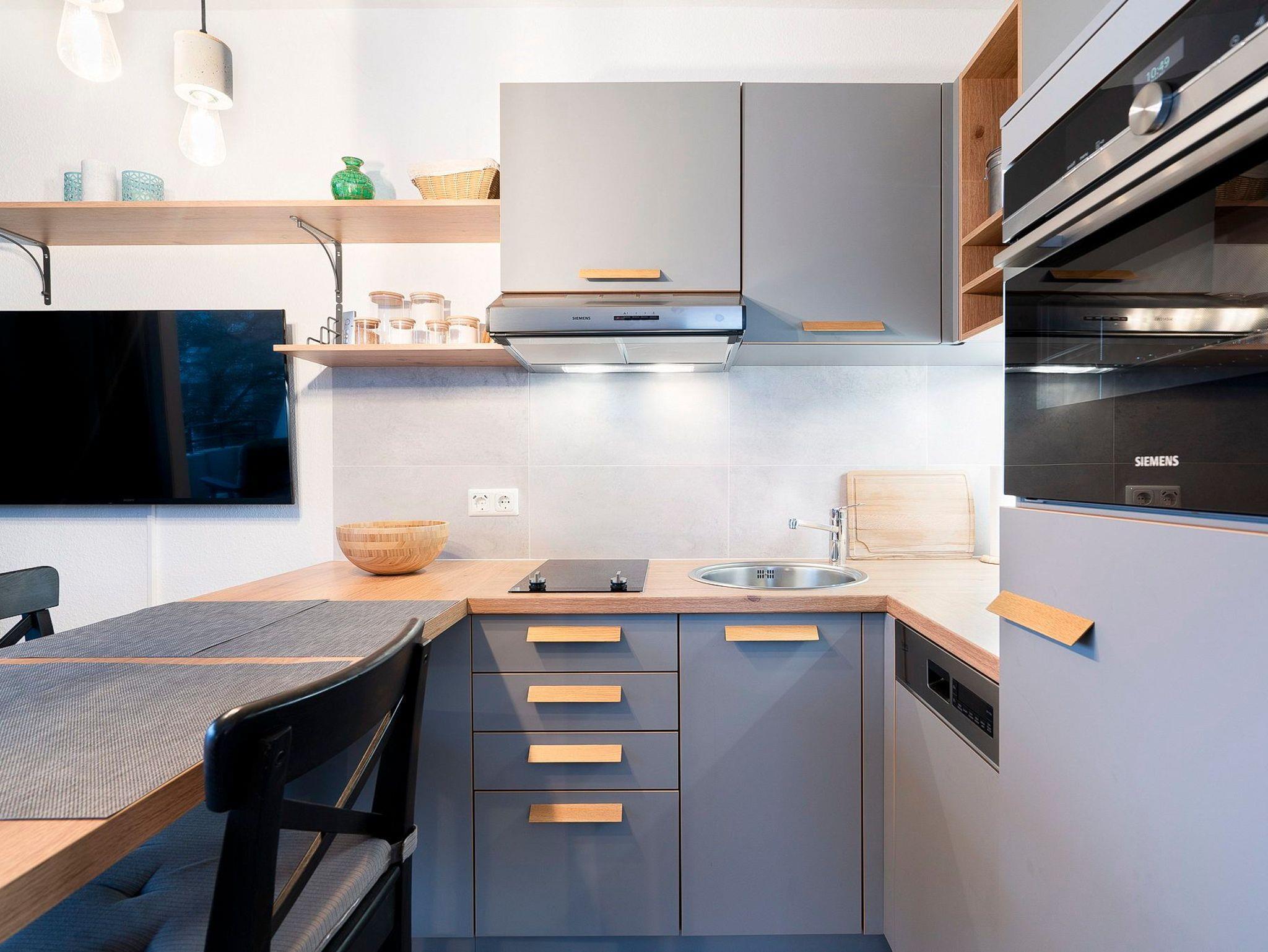 Zum Wohnzimmer gibt es eine offene Küchenzeile mit 2-Platten-Cerankochfeld, Spülmaschine, Backofen und Kühlschrank mit kleinem Gefrierfach. Ebenso stehen eine Kaffeemaschine und ein Wasserkocher zur Verfügung.