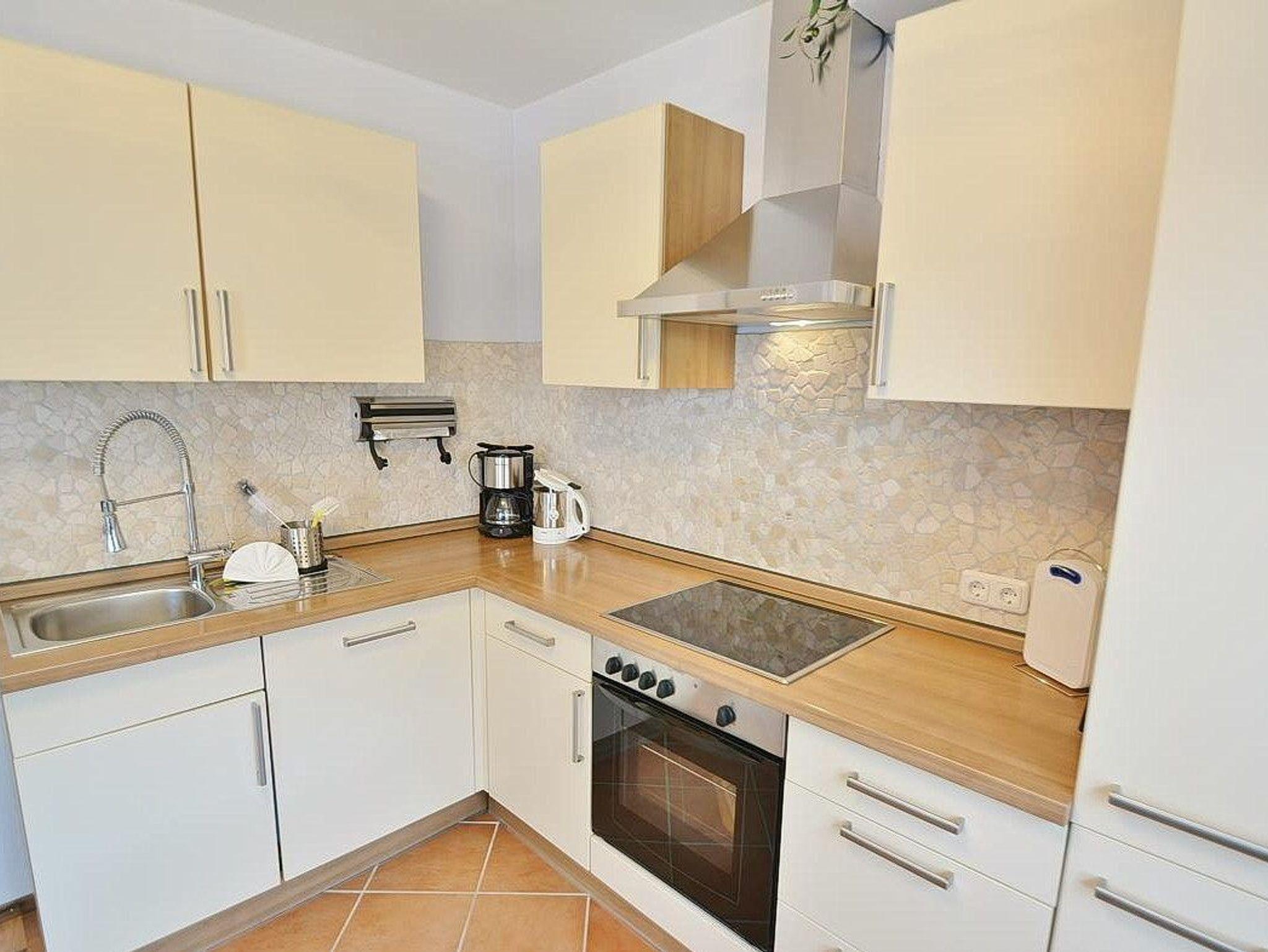 Moderne, komplett ausgestattete zum Wohn- und Esszimmer offene Küche mit 4 Platten Cerankochfeld, Backofen, Kühlschrank mit kleinem Gefrierfach, Kaffeemaschine, Toaster und Wasserkocher.