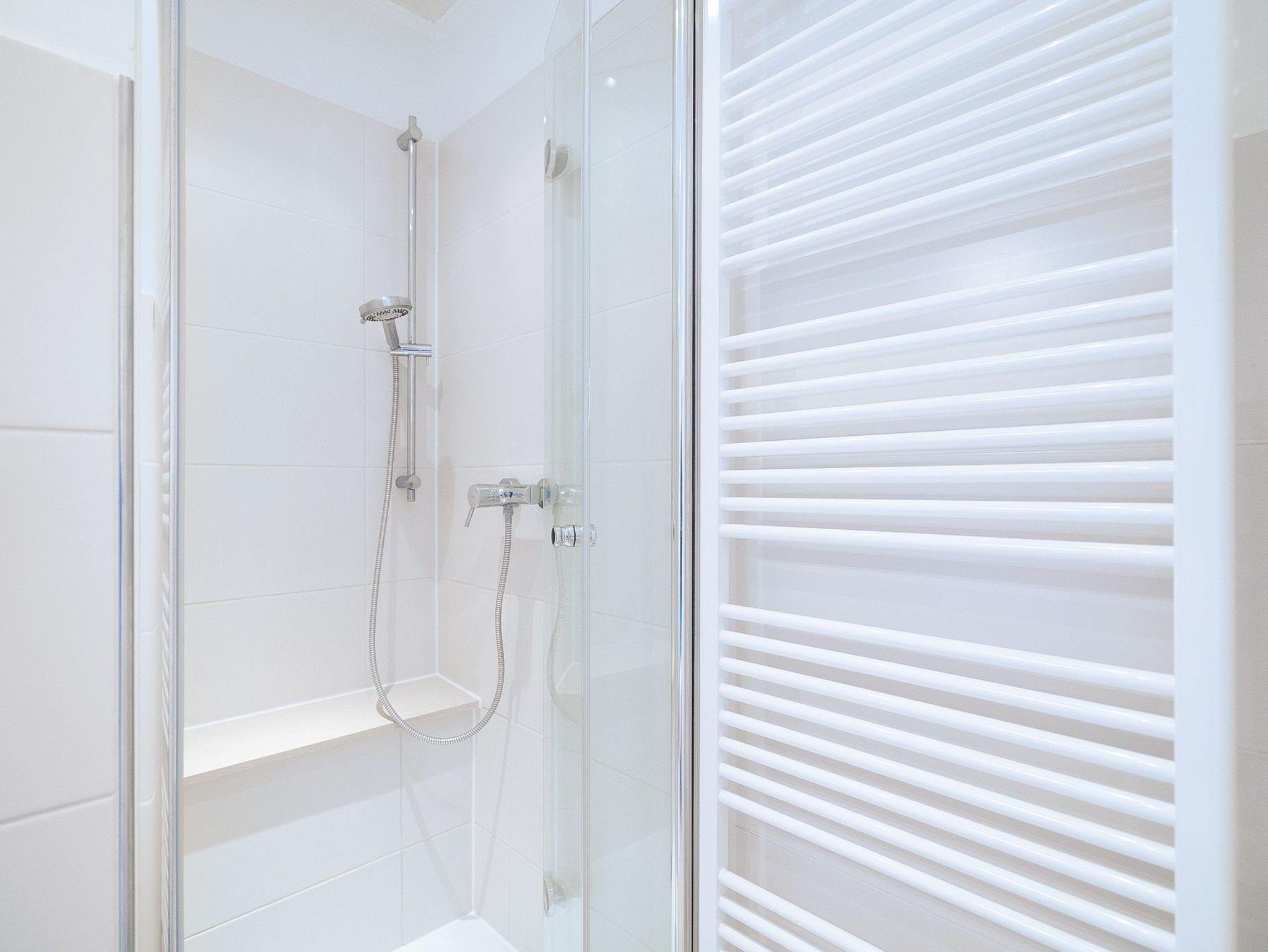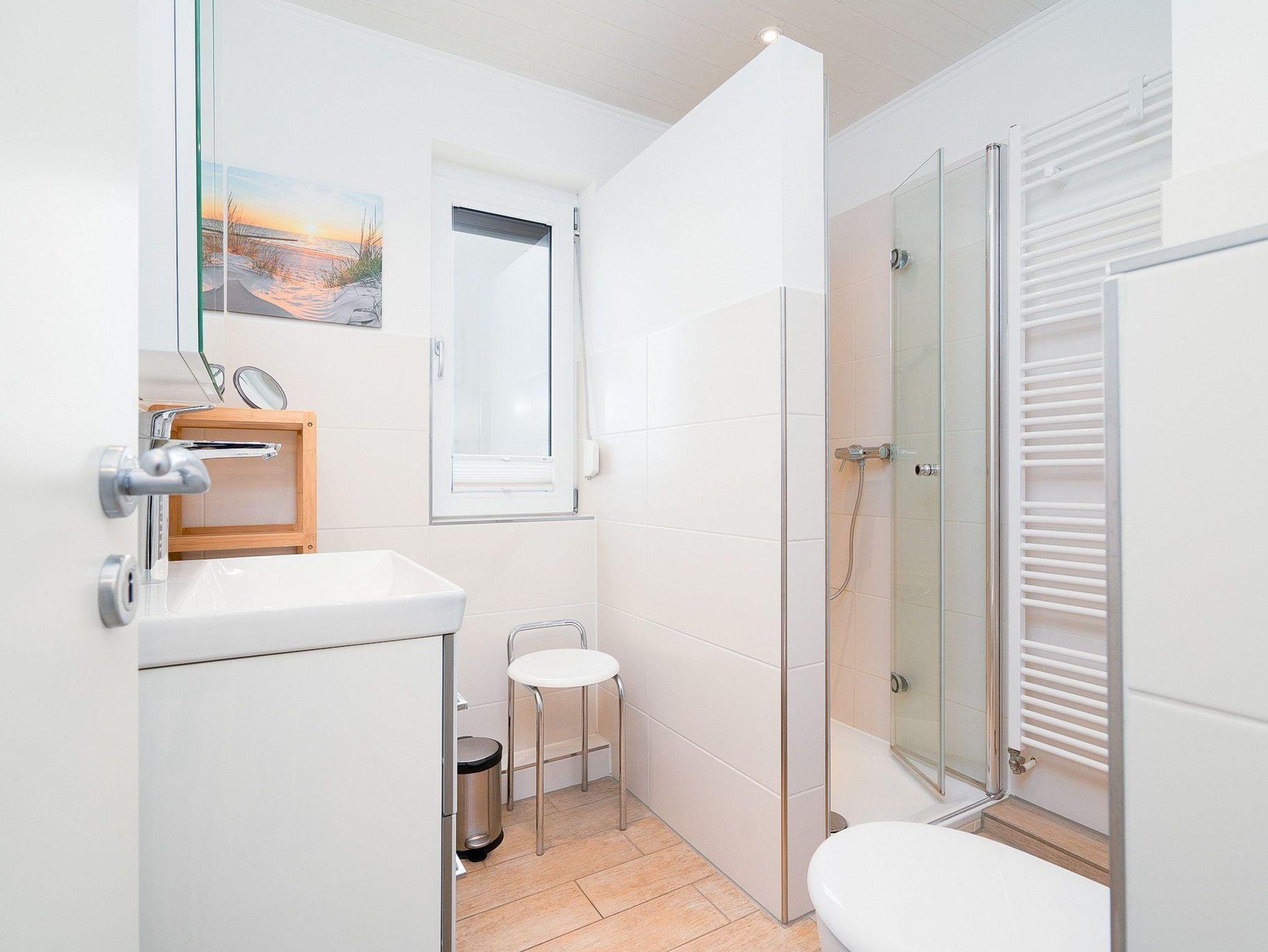 Freundliches, modernes und helles Tageslichtbad mit Dusche, WC und Waschbecken.
