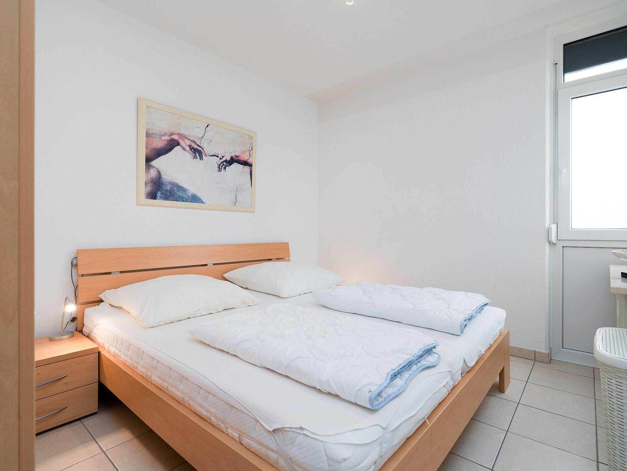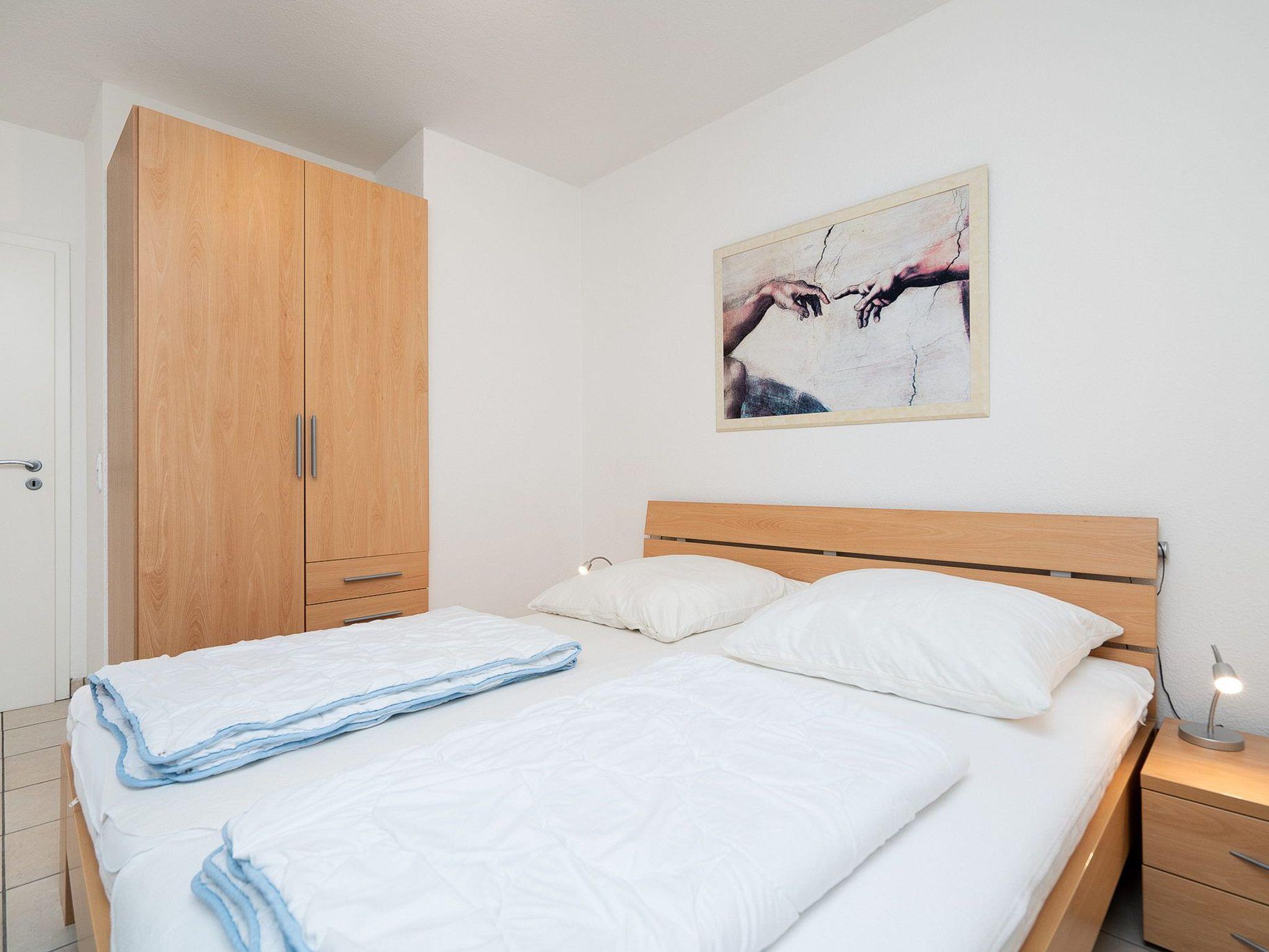 Das hell geflieste Schlafzimmer ist mit einem Doppelbett (2x90x200cm) und einem Kleiderschrank ausgestattet. Das Fenster lässt sich durch Außenjalousien verdunkeln.