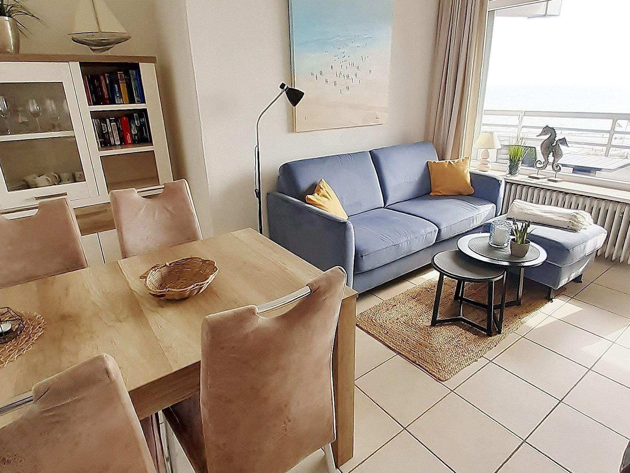 Modern ausgestattetes Wohn- und Esszimmer mit direktem Zugang zum Balkon und mit schönem Ausblick auf das Meer. Das Zimmer ist hell gefliest und mit einem Essplatz für 4 Personen, einer Eckcouch, einem Sessel und einer Kommode ausgestattet. Zur Unterhaltung steht ein Flachbild-TV zur Verfügung.