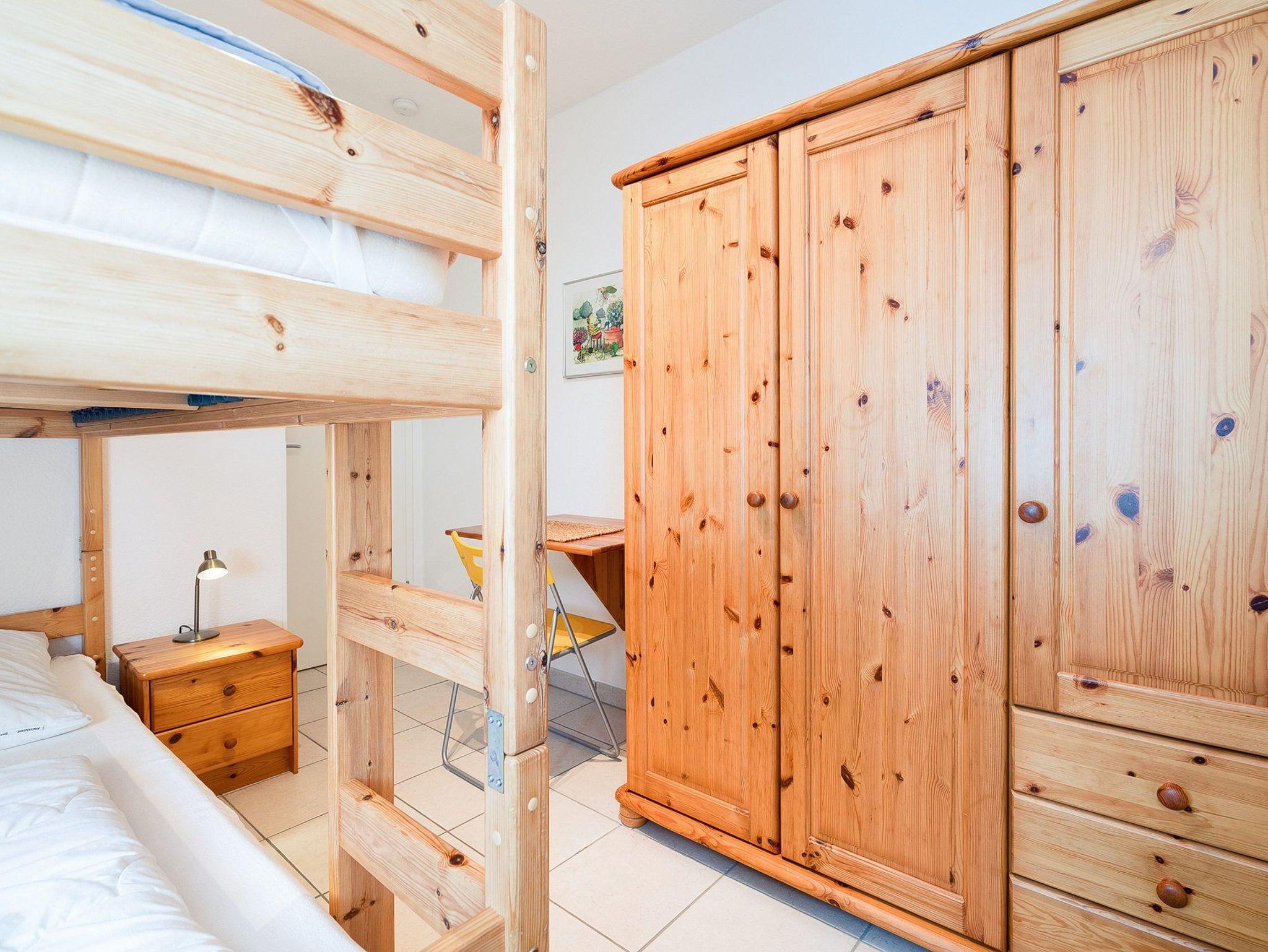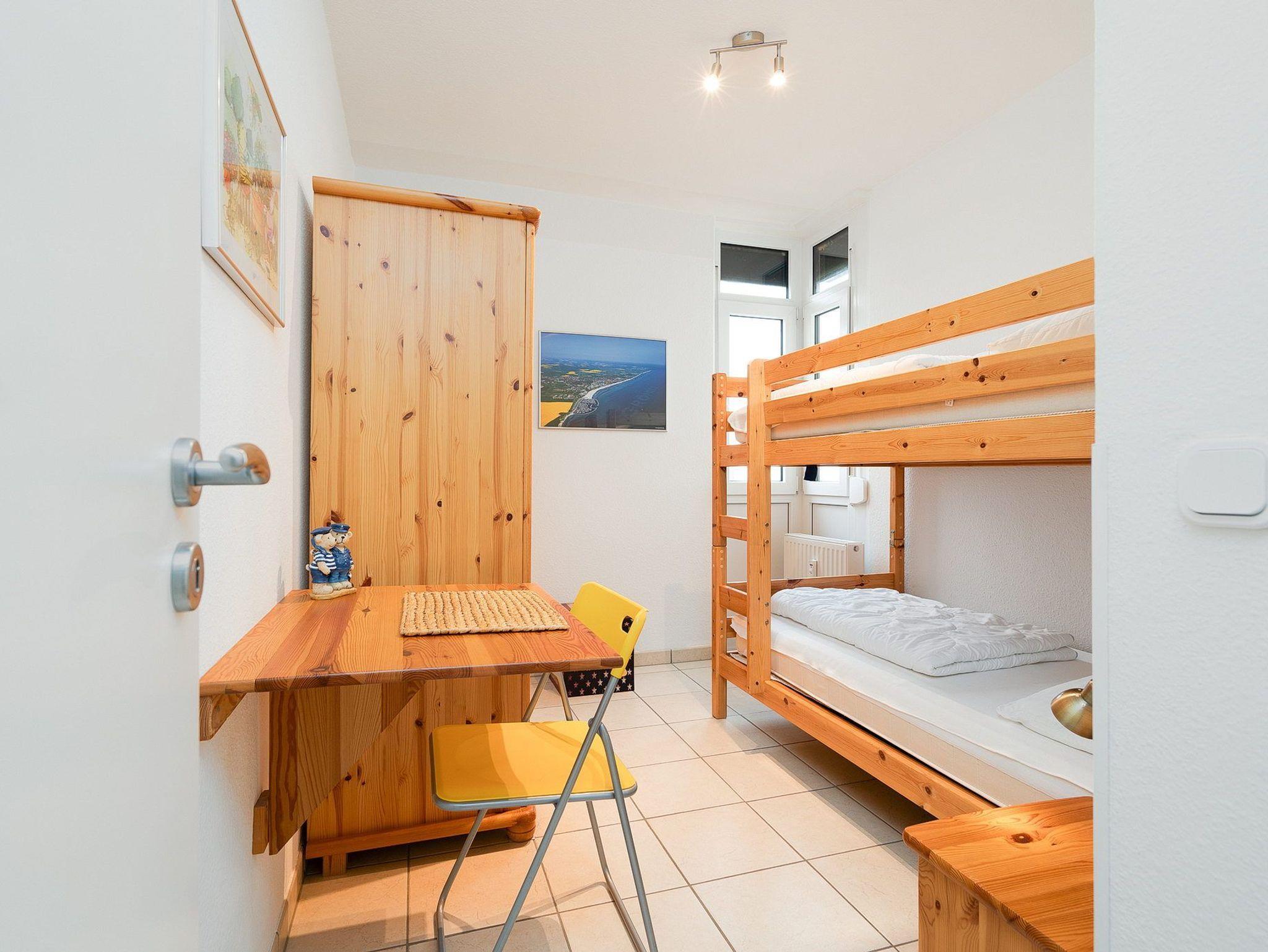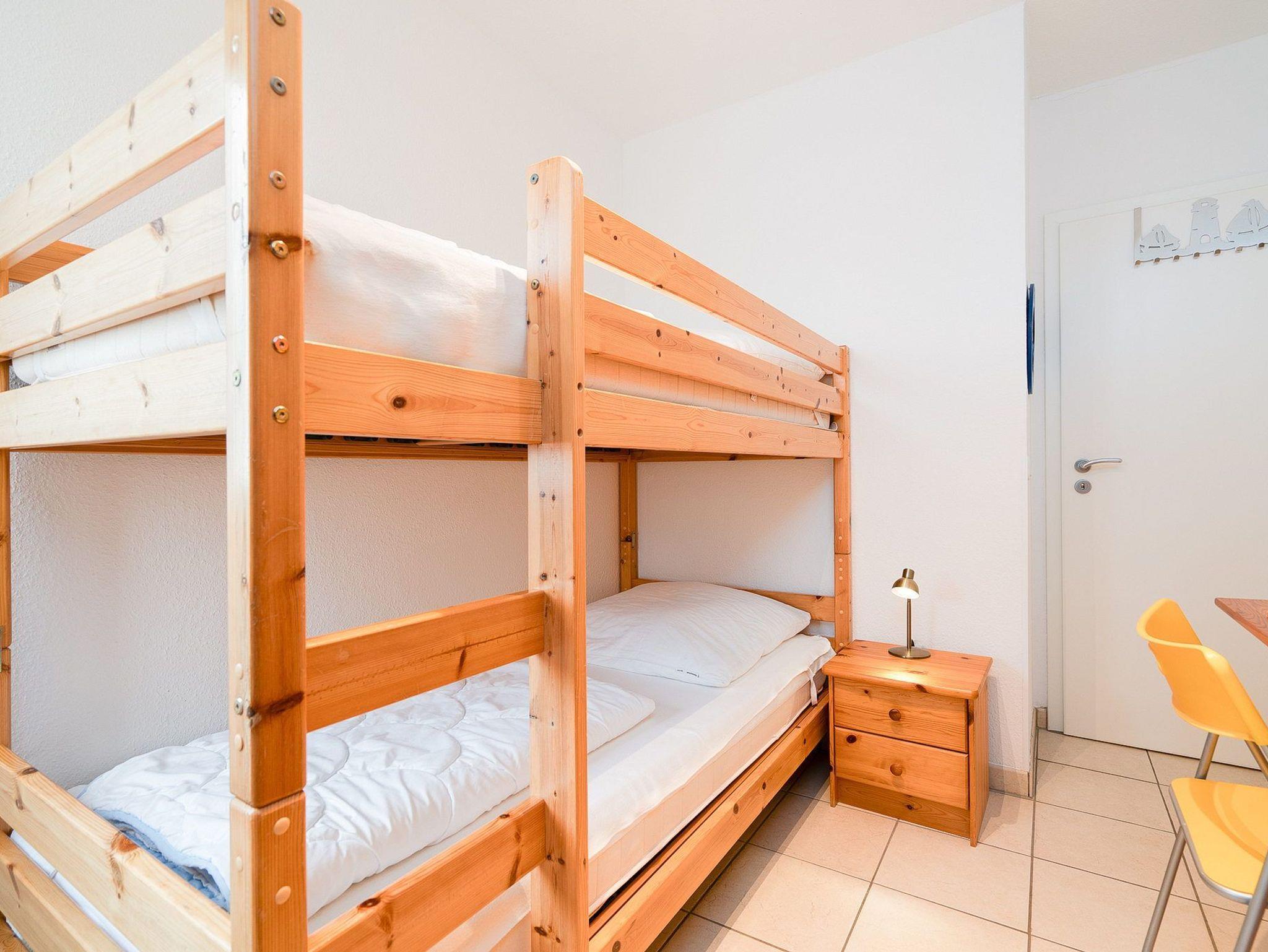 Das separate, kleine Kinderzimmer ist hell gefliest und mit einem Etagenbett, einem Kleiderschrank und einem Schreibtisch ausgestattet. Das Zimmer lässt sich durch Außenjalousien verdunkeln.