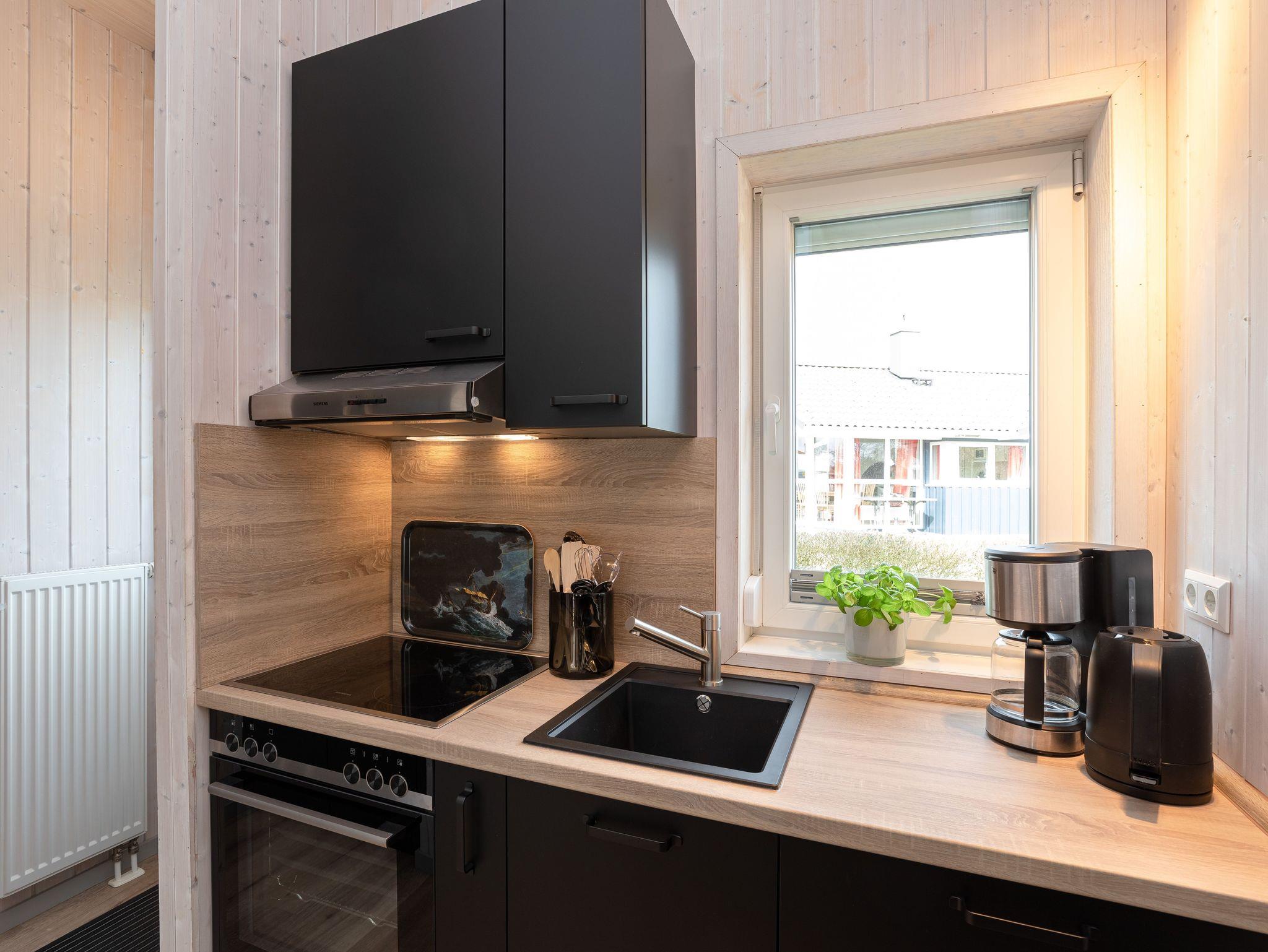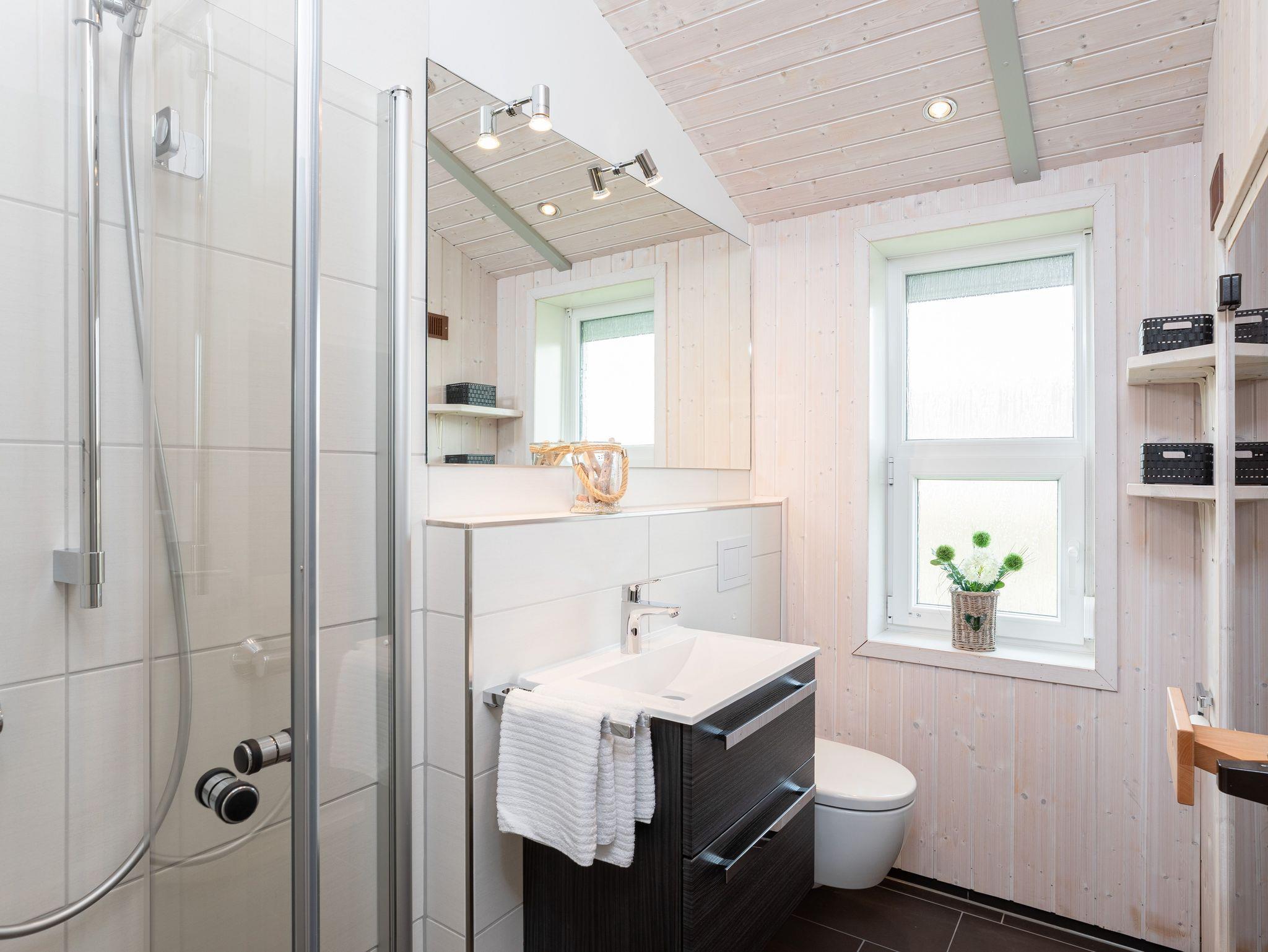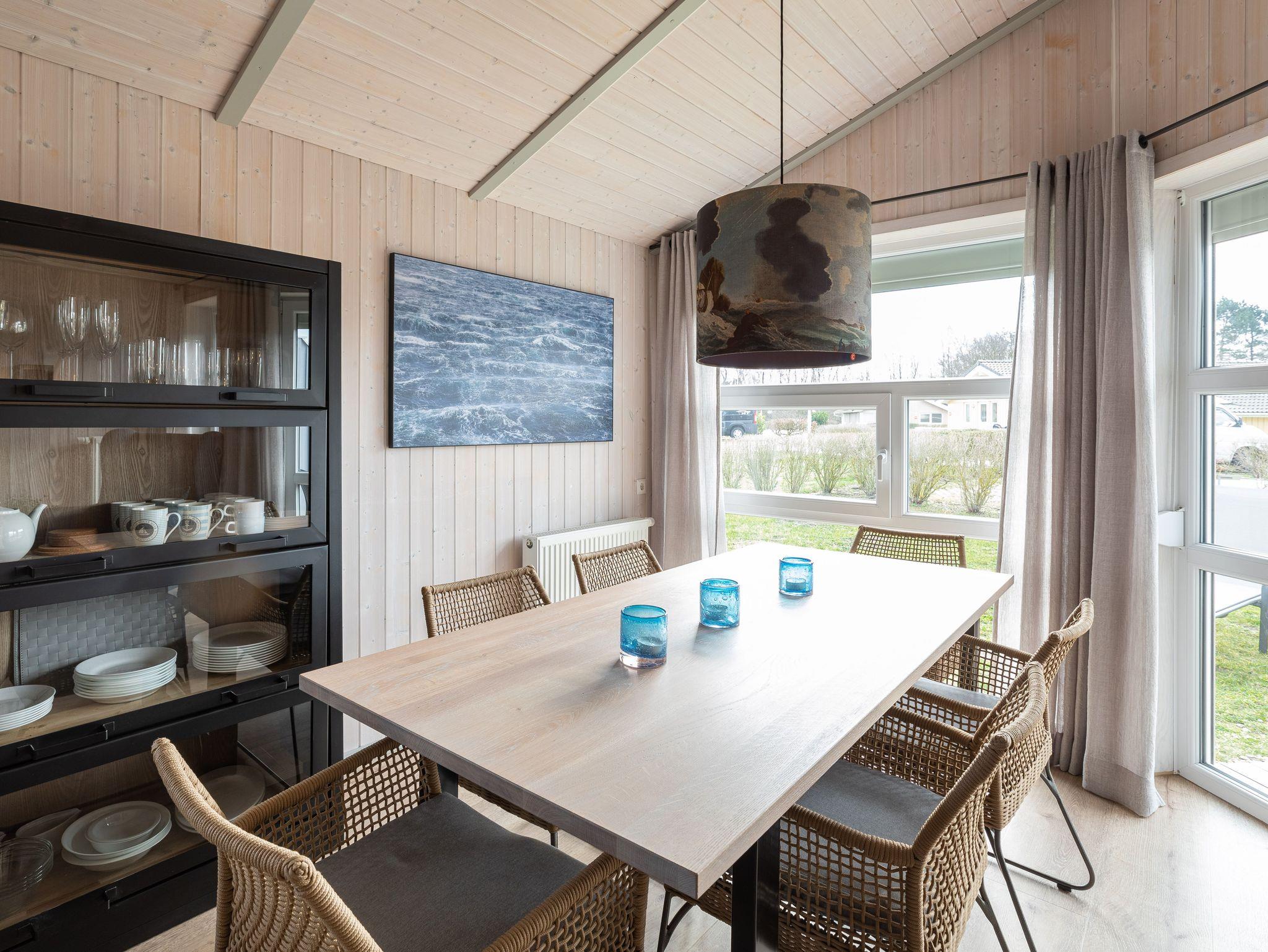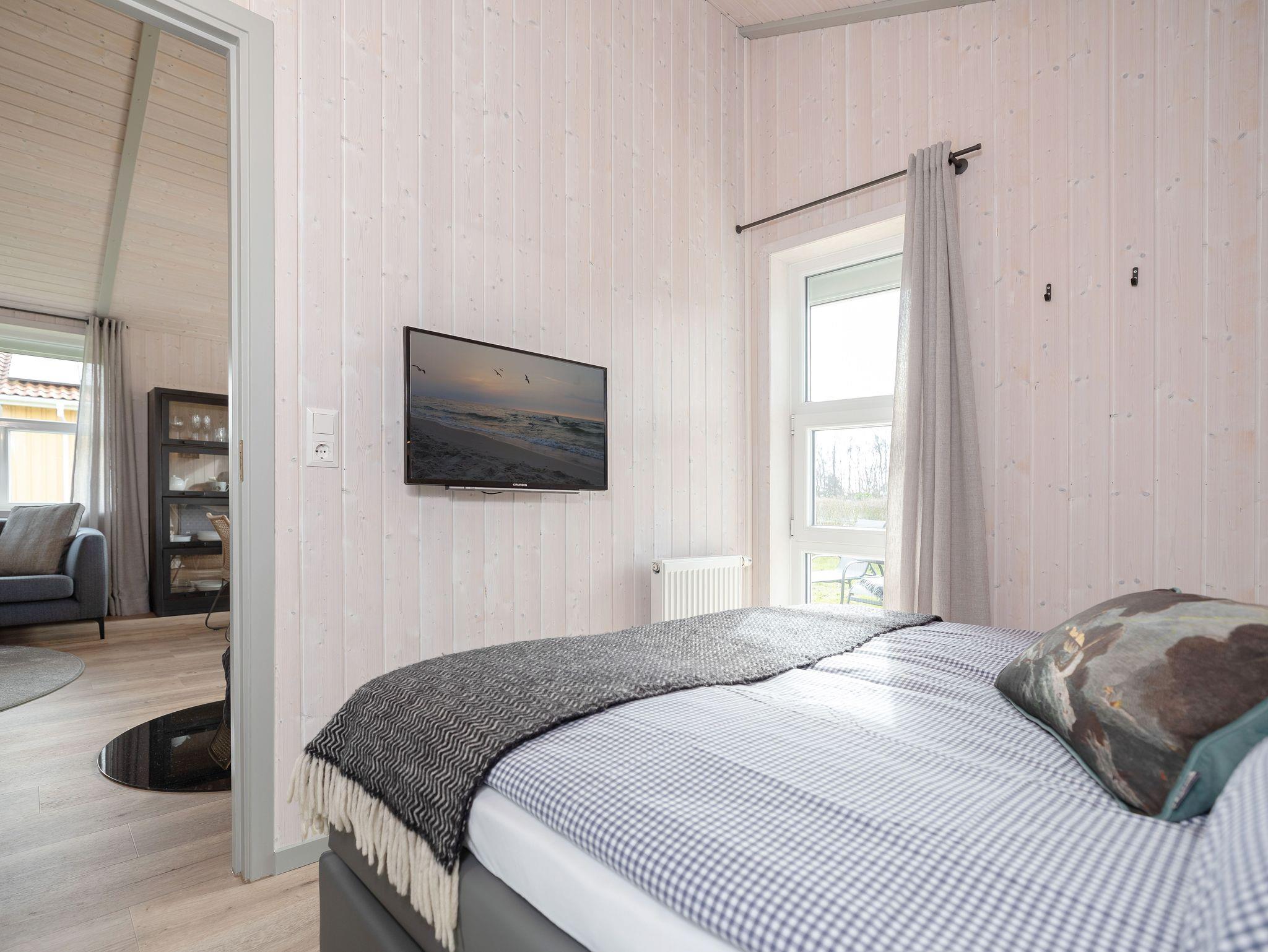 Der gemütliche Wohnbereich mit komfortabler Sofaecke, TV und Kamin lädt bei jeder Witterung zu lauschigen Stunden ein. In den hellen Wohnbereich integriert ist ein Essplatz direkt am Fenster für bis zu 6 Personen, sowie eine Küchenzeile mit Backofen, Ceranherd und Spülmaschine. Vom Wohn-/Essbereich führt ein direkter Zugang auf Ihre teilweise überdachte Terrasse und den großzügigen, locker von Hecken umsäumten Garten. Das Duschbad begeistert mit Wellnessfaktoren wie Fußbodenheizung und eigener Trockensauna. Eines der Schlafzimmer ist mit komfortablem Boxspringbett (160x200 cm) mit durchgängiger Matratze, Kleiderschrank und zusätzlich Fernseher ausgestattet, ein weiteres Schlafzimmer verfügt über 2 Einzelbetten (je 80x200cm). Das gesamte Interieur ist gemütlich und hell im zeitlosen skandinavischen Stil gestaltet.