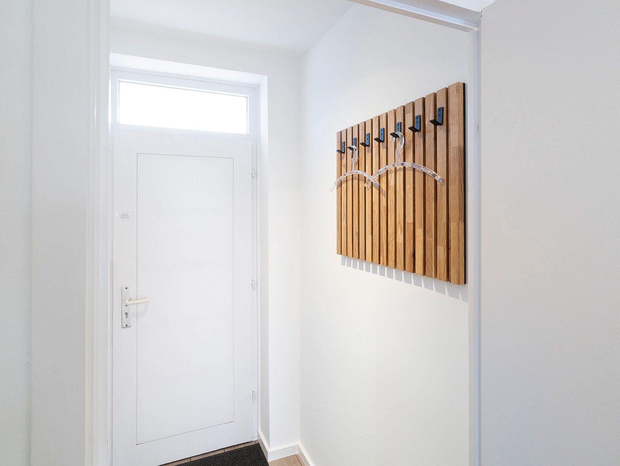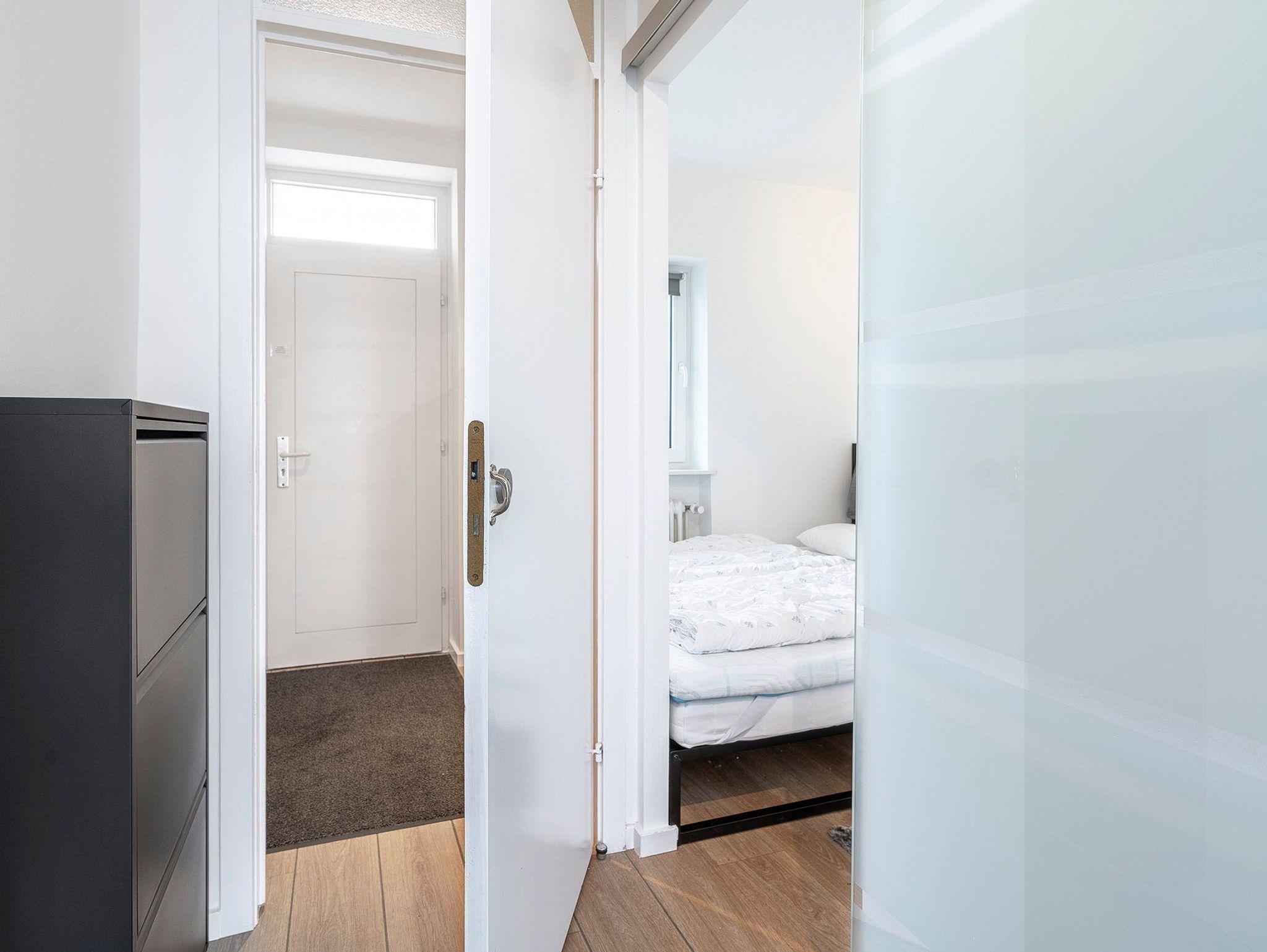 Das separate Schlafzimmer ist mit einem Doppelbett (1x 180 x 200cm) und einem 1-türigen Kleiderschrank ausgestattet. Das Zimmer ist mit Designer-Planken ausgelegt. Ein weiterer Kleiderschrank befindet sich im Flur. Das Fenster zum Laubengang lässt sich blickdicht verdunkeln.