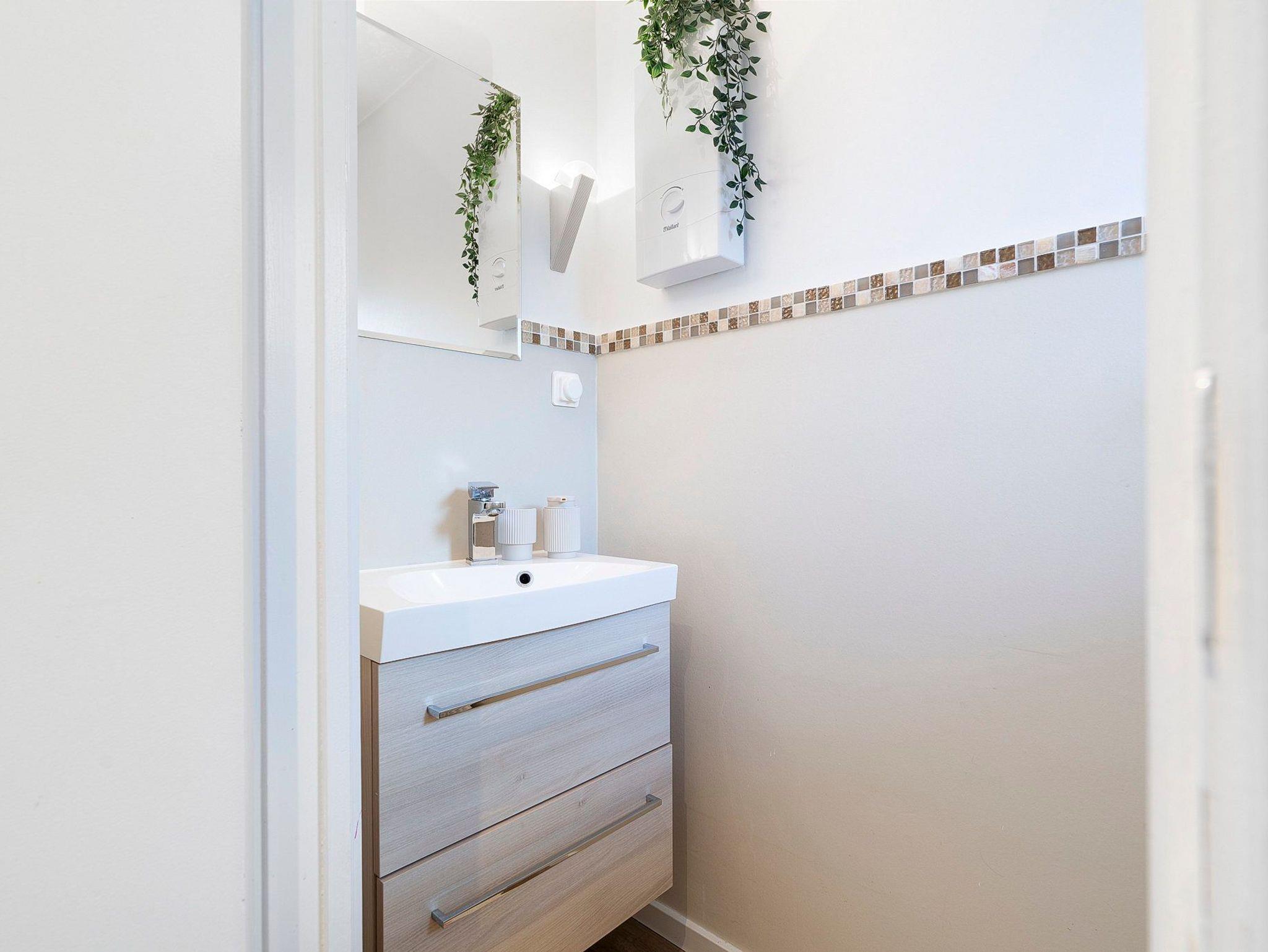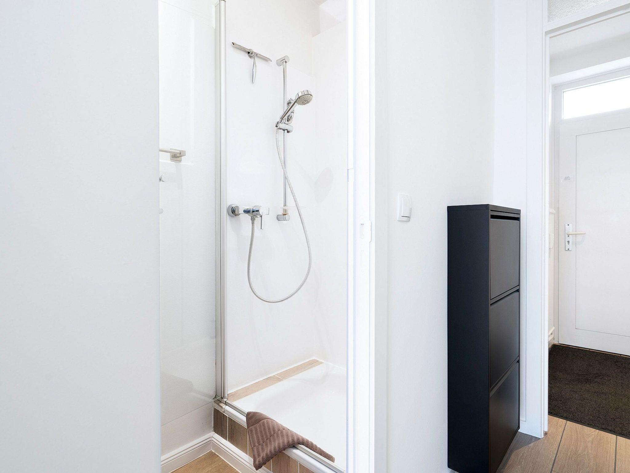 Innenliegendes modernes, hell gefliestes, kleines Bad mit Dusche und Waschbecken. Separates kleines WC mit Tageslicht.