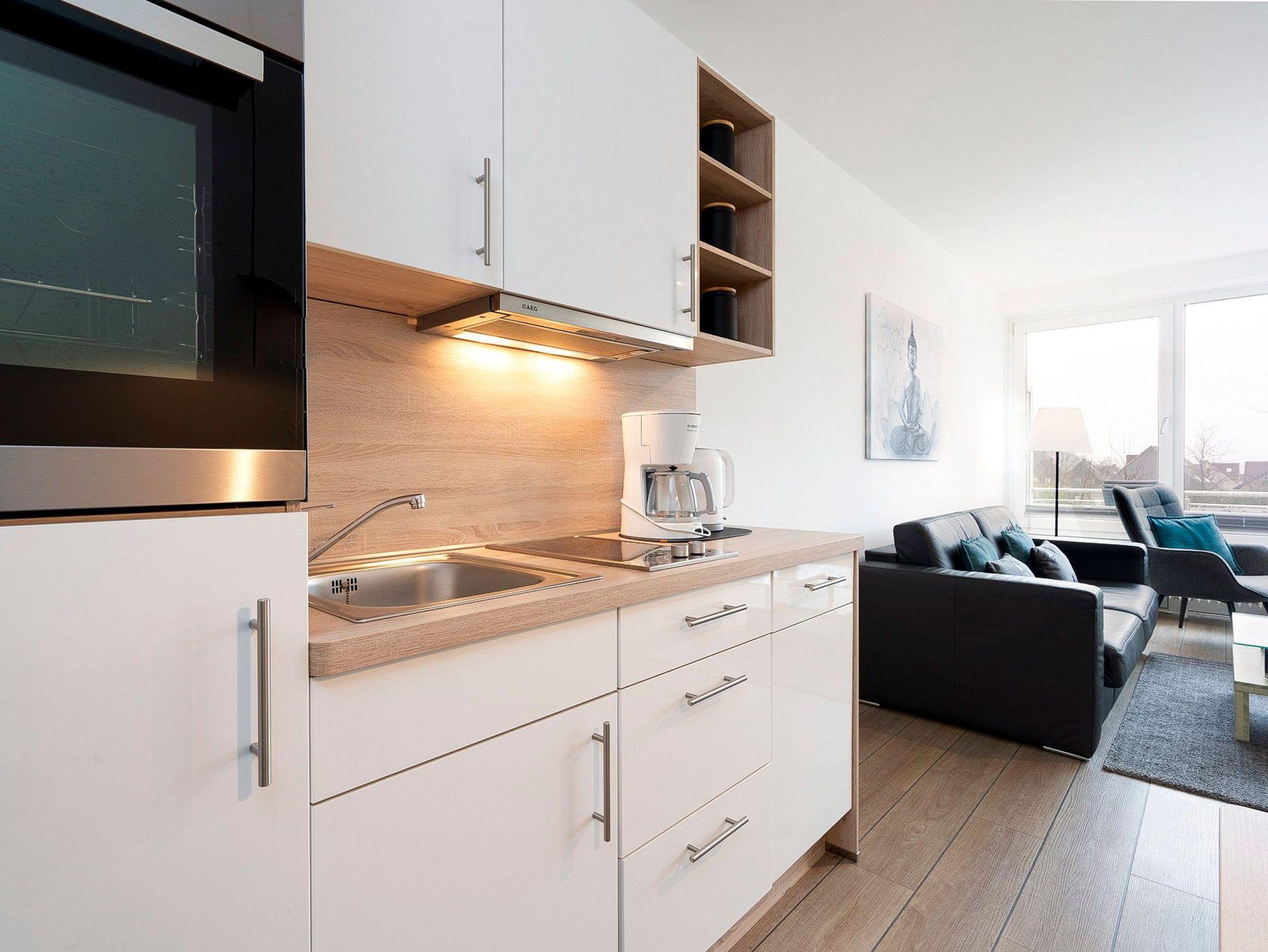 Moderne, komplett eingerichtete, zum Wohn- und Esszimmer offen Küche. Zur Verfügung steht ein 2-Platten Cerankochfeld, ein Backofen, ein Kühlschrank mit kleinem 3-Sterne Gefrierfach, eine Spülmaschine, eine Kaffeemaschine und ein Toaster.