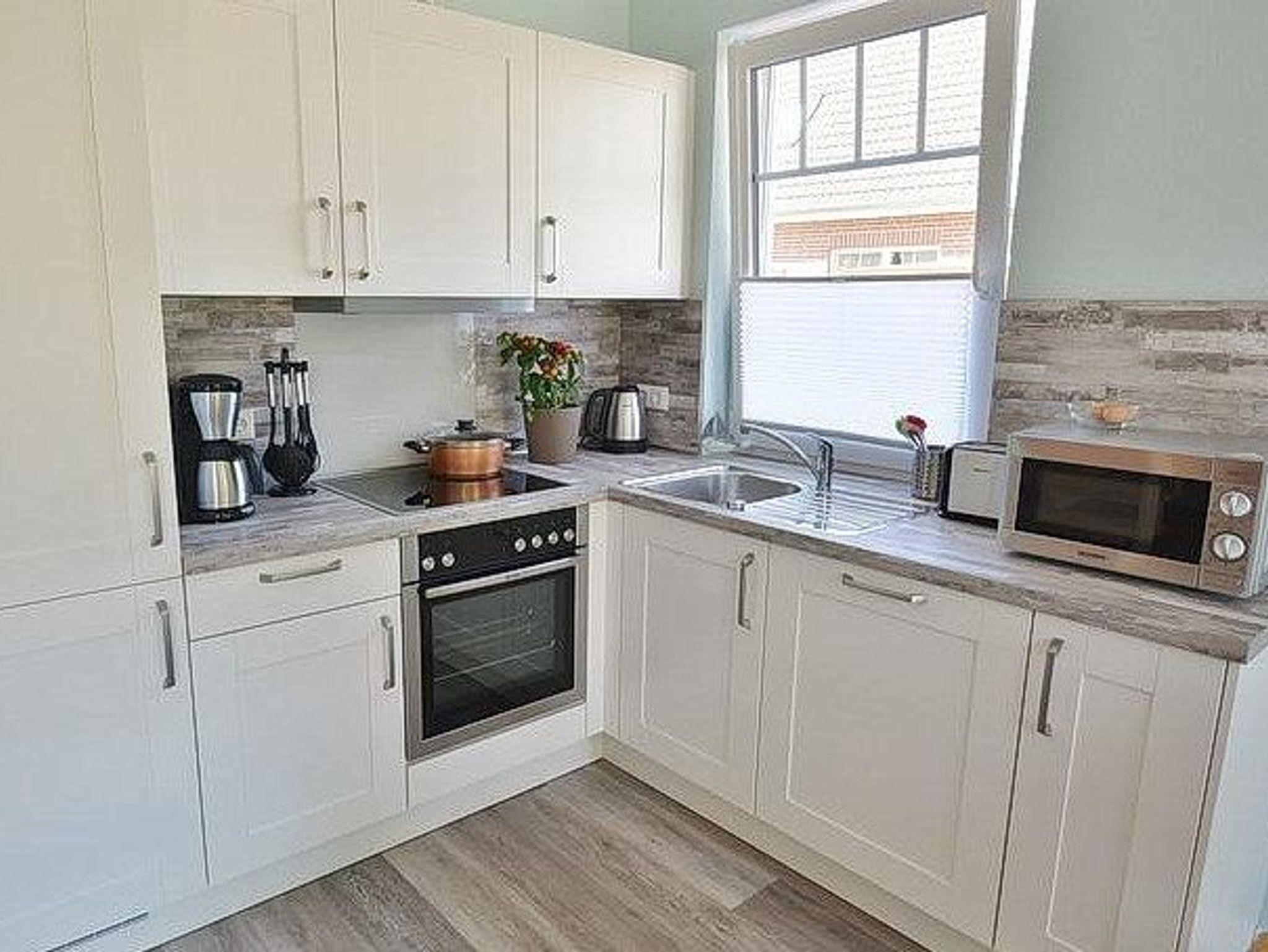 Moderne zum Wohnzimmer offene komplett ausgestattete Küche mit 4-Platten-Cerankochfeld, Kühlschrank mit 3-Sterne Gefrierfach, Backofen und Spülmaschine. Zur Verfügung stehen außerdem eine Kaffeemaschine, ein Toaster, eine Mikrowelle, ein Eierkocher sowie ein Wasserkocher.