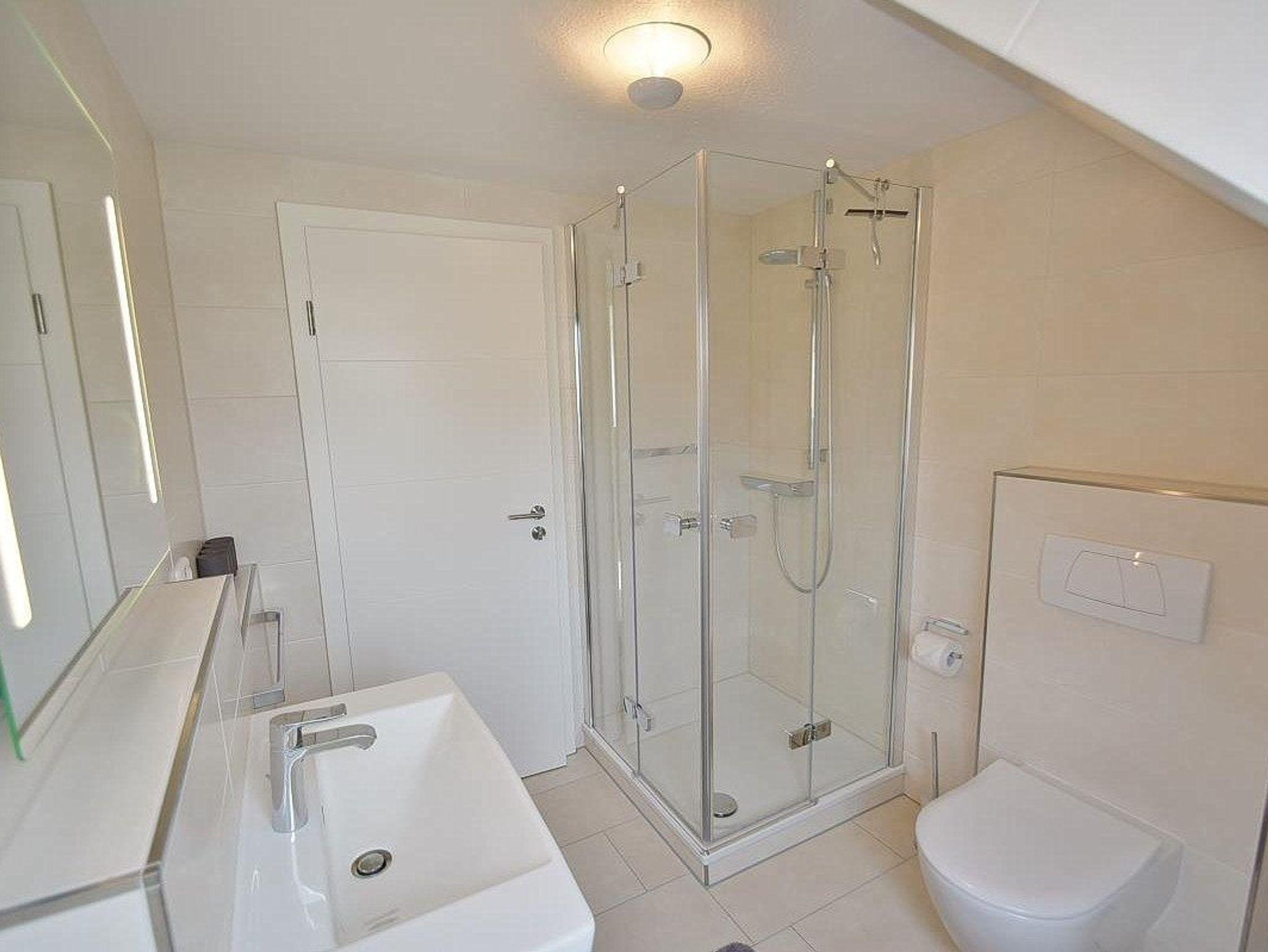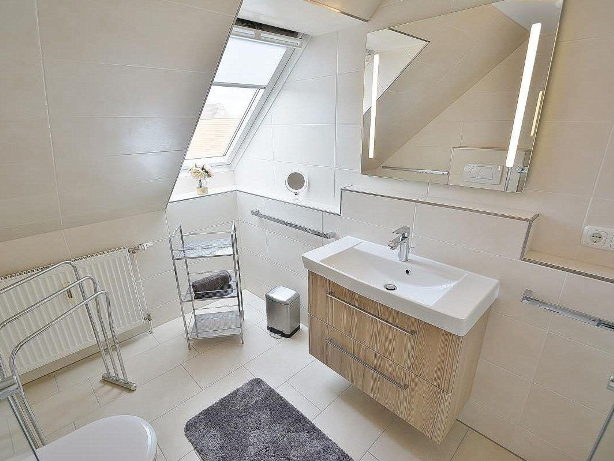 Modernes, hell gefliestes Tageslichtbad im 2.OG. Das Bad verfügt über eine Dusche, Waschbecken und WC. Ein weiteres modernes WC befindet sich im 1. OG.