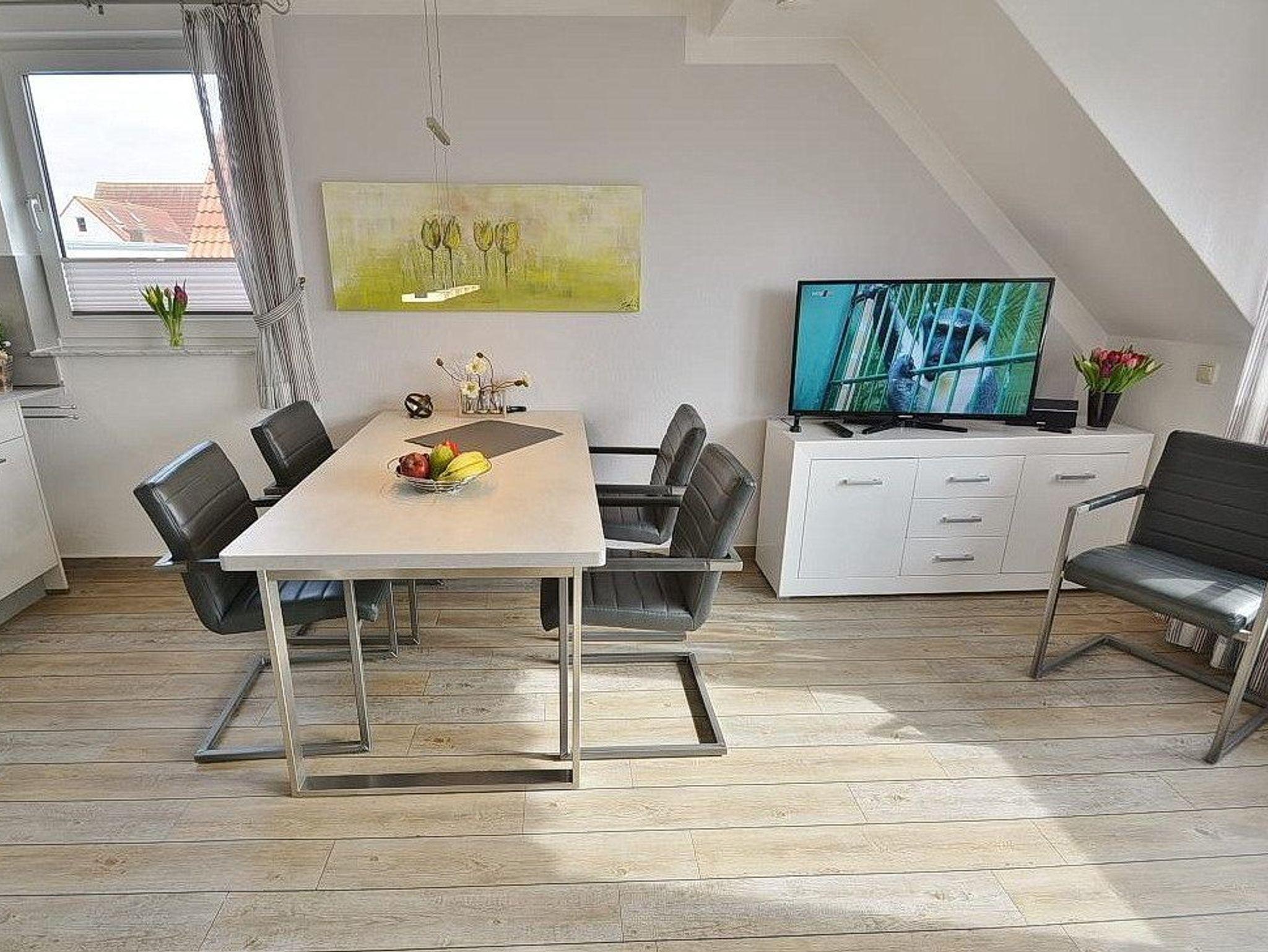 Modernes, freundliches Wohn- und Esszimmer im 1. OG mit direktem Zugang zum Balkon in süd-östliche Richtung. Das Wohn- und Esszimmer ist mit einem Essplatz für 6 Personen, einem Sofa (3-Sitzer), 2 Sesseln, einem Couchtisch und 2 Kommoden ausgestattet. Zur Unterhaltung stehen ein Flachbildfernseher und ein Radio zur Verfügung. Das Wohn- und Esszimmer ist mit Designer-Planken ausgelegt. An den Fenstern befinden sich Plissees.