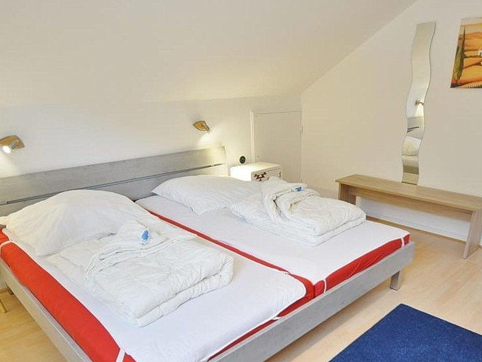 Großzügiges Schlafzimmer mit Doppelbett (2x 100x200cm) und Kleiderschrank. Das Schlafzimmer ist mit Laminatboden ausgelegt. Das Fenster lässt sich durch ein Außenrollo verdunkeln.