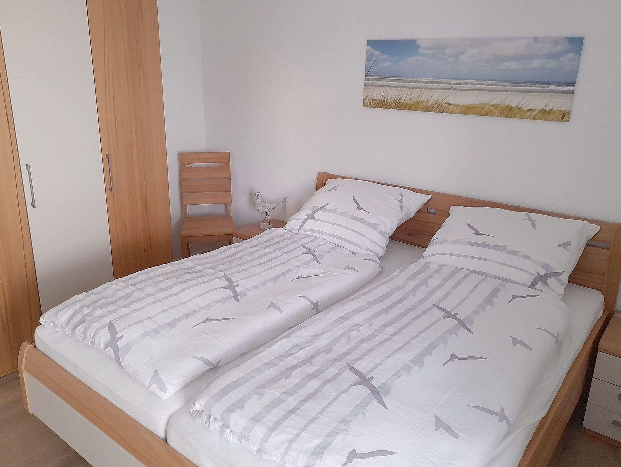 Modernes, freundliches Schlafzimmer mit Vinyl-Parkettboden. Das Schlafzimmer ist mit einem Doppelbett (2x90x200cm), einem großen Kleiderschrank und einem TV-Flachbildschirm ausgestattet. Durch die Terrassentür gelangen Sie direkt auf die Terrasse. Ein Aussenrolladen dunkelt das Zimmer ab.