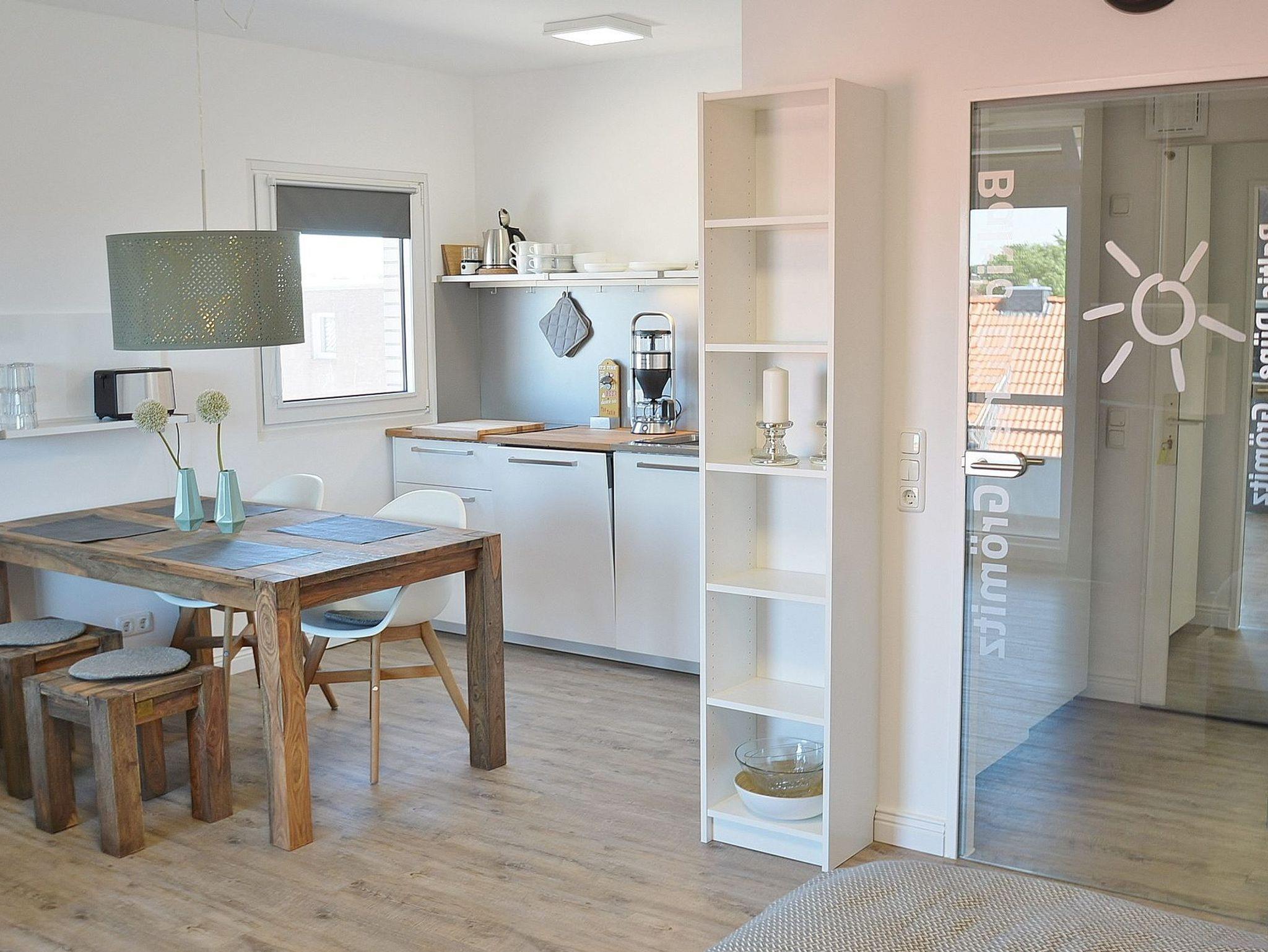 Moderne, komplett eingerichtete, zum Wohnbereich offene Küche. Die Küche ist mit einem Ceran- Kochfeld, einer Spülmaschine, einem Wasserkocher, Toaster, Kaffeemaschine, einem Kühlschrank und einer Mikrowelle ausgestattet.