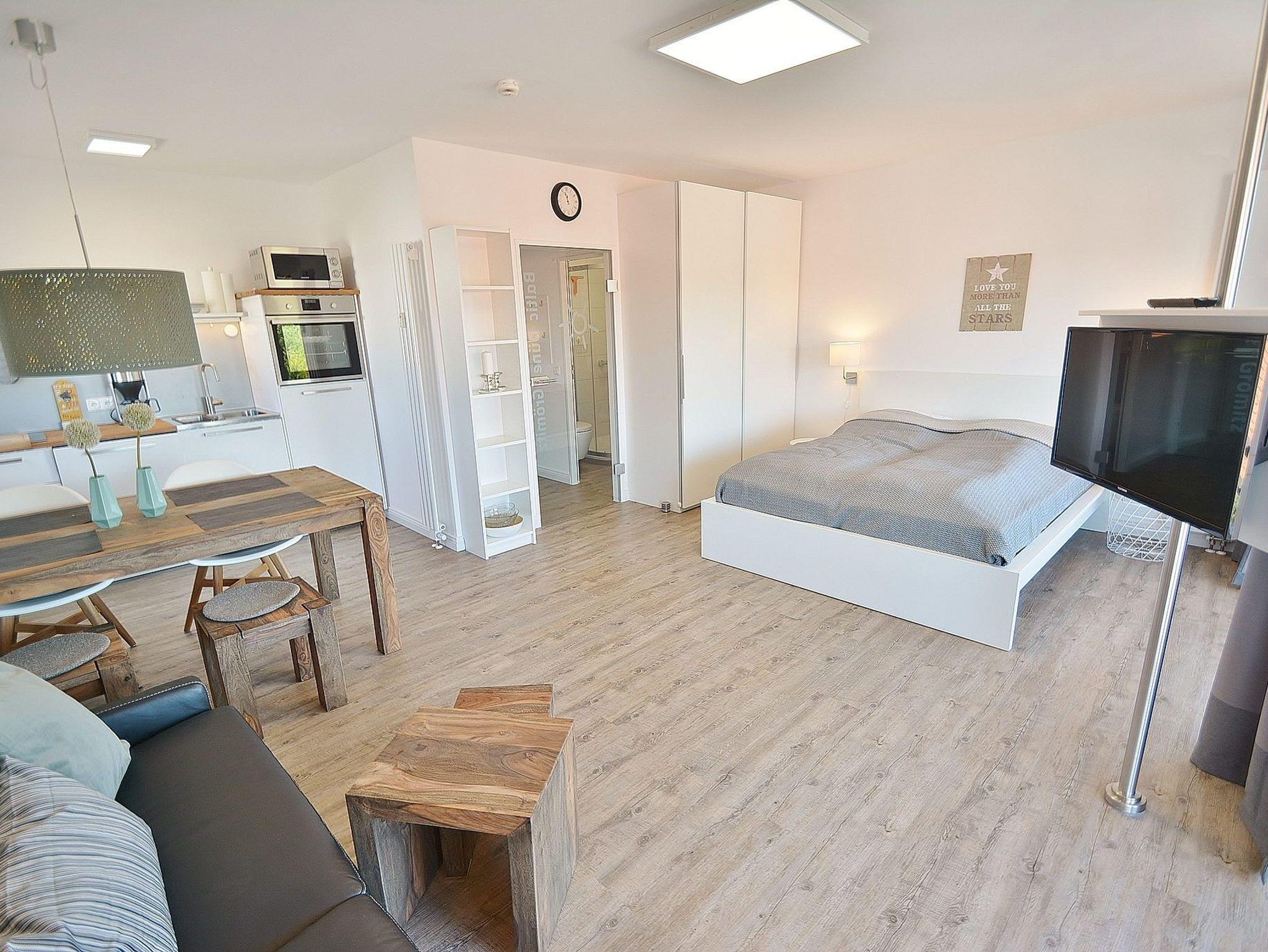 Moderner, freundlicher und heller Wohnbereich mit direktem Zugang zum Balkon. Der Wohnbereich ist mit einer Couch, einem Couchtisch, einem Essbereich für 4 Personen, einem Doppelbett und einem 2-türigem Kleiderschrank ausgestattet. Zur Unterhaltung steht ein Flachbildschirm zur Verfügung.