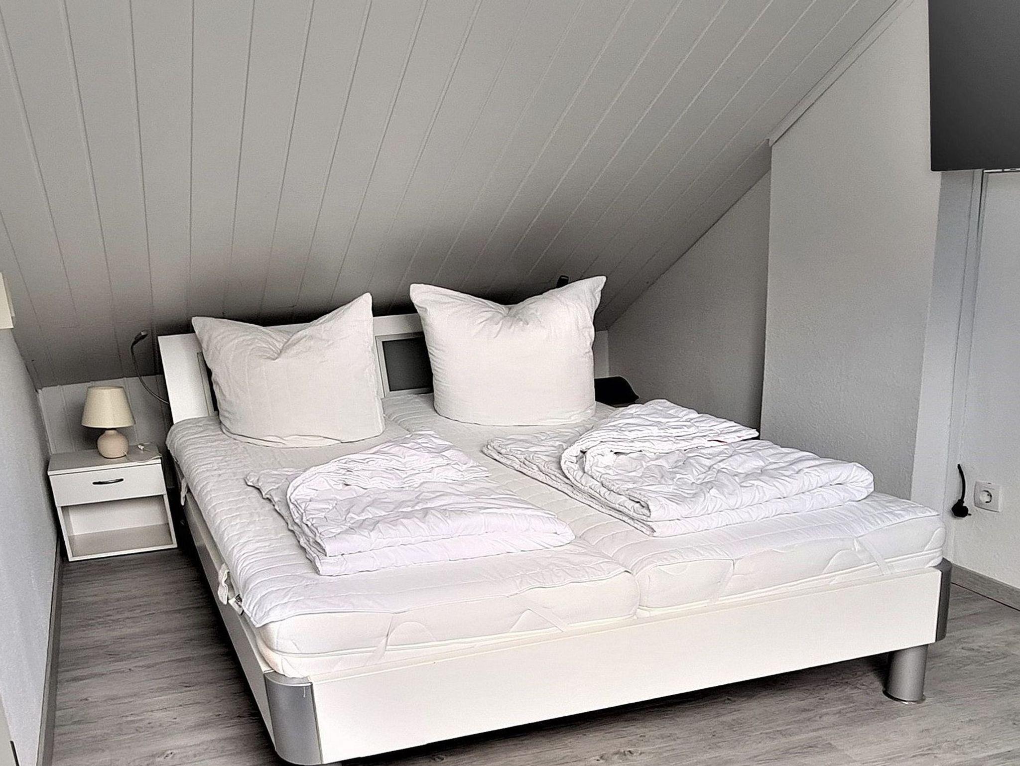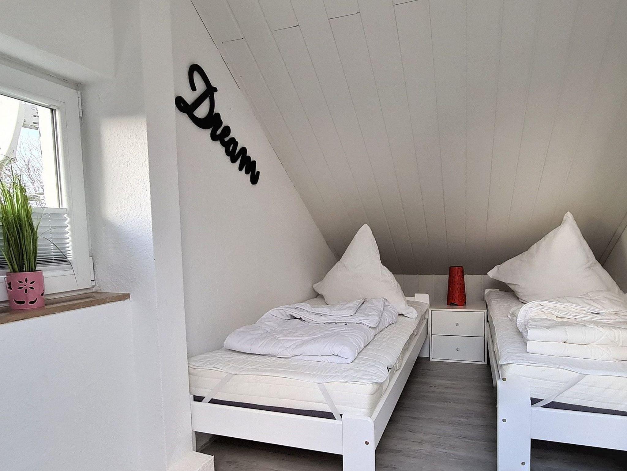 Das Schlafzimmer befindet sich im Obergeschoss und ist mit einem Doppelbett (Größe: 2x80x200cm) und einem Kleiderschrank ausgestattet. Die Fenster lassen sich mit Rollos verdunkeln. Bettwäsche und Handtücher sind mitzubringen oder anzumieten.