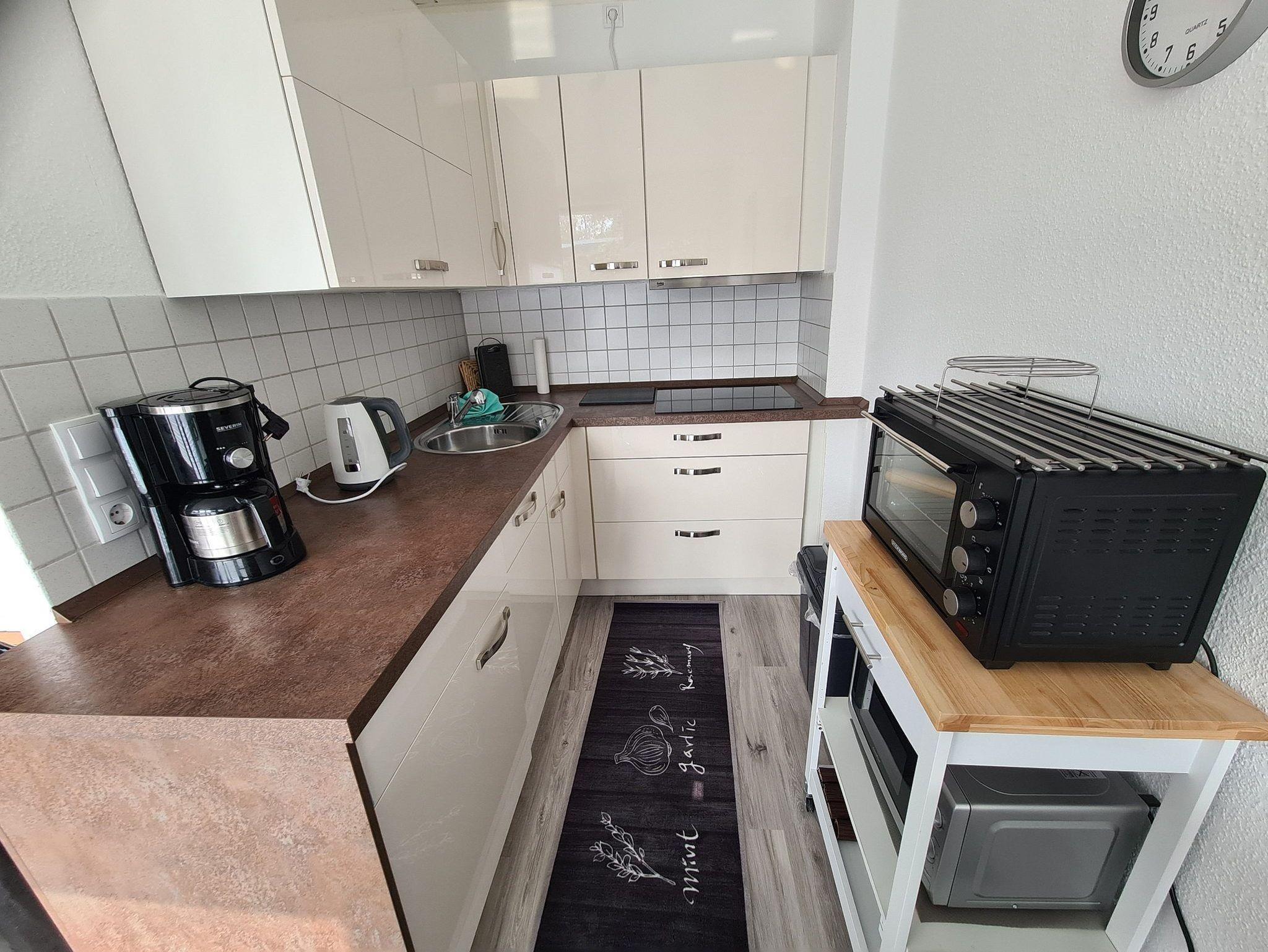 Eine abgeteilte, komplett ausgestattete Küche mit Essgruppe ist im Wohnzimmer integriert. Es gibt eine Spülmaschine, Mikrowelle, Wasserkocher, Kaffeemaschine, Toaster sowie einen mobilen Backofen.