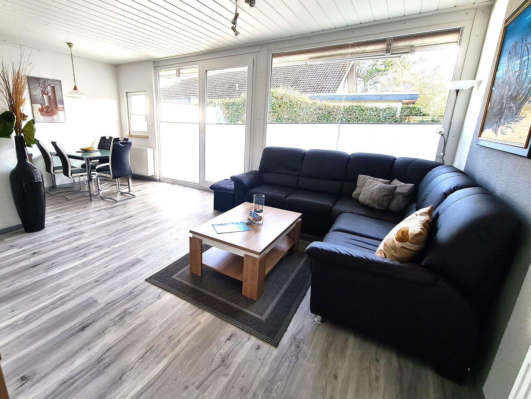 Das große, moderne Wohnzimmer (Vinylboden) ist mit Sat-TV und einem Radio ausgestattet und befindet sich im Erdgeschoss.