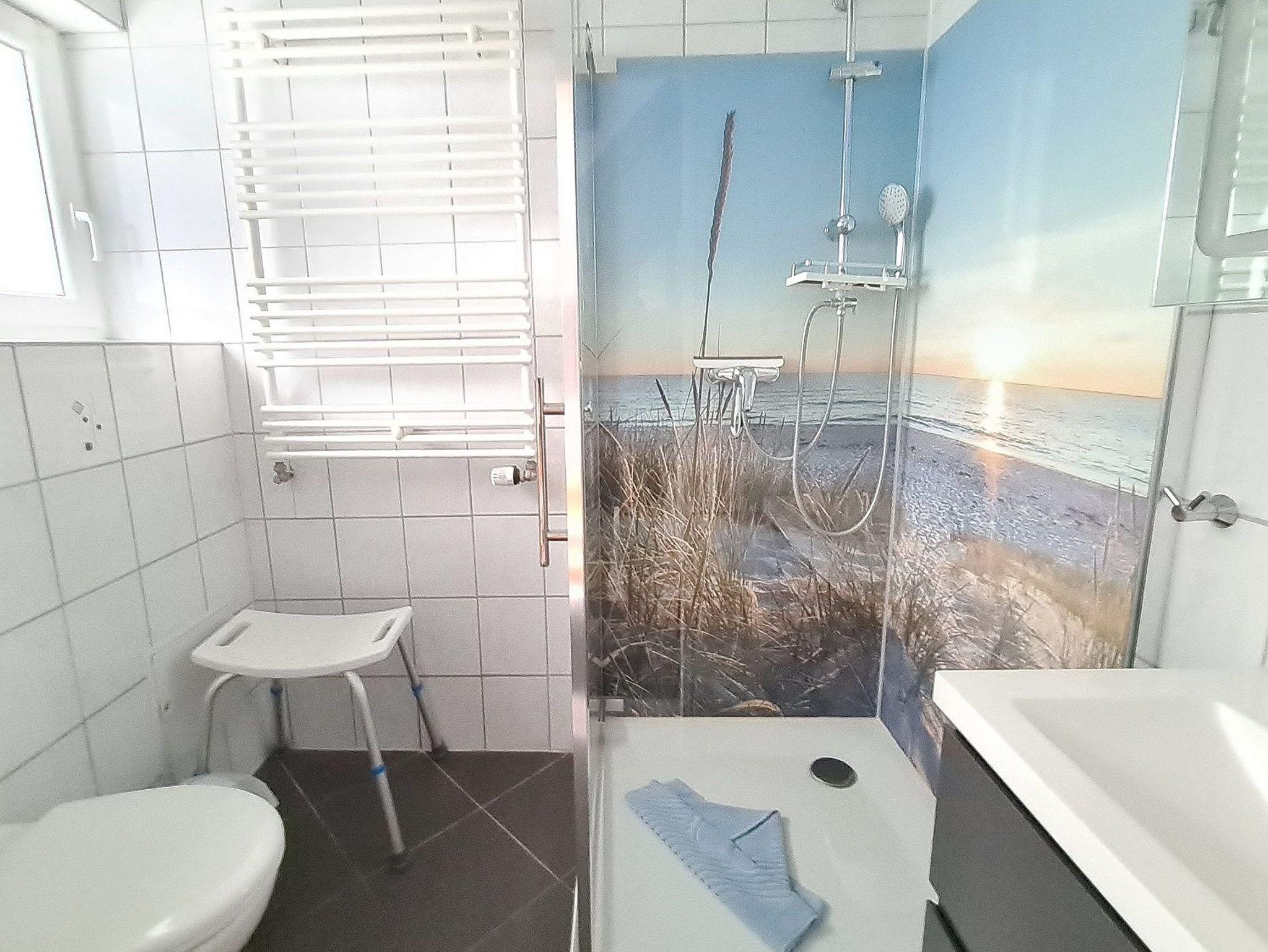 Modernes, hell gefliestes Tageslichtbad mit Dusche, WC und Waschbecken im Erdgeschoss.