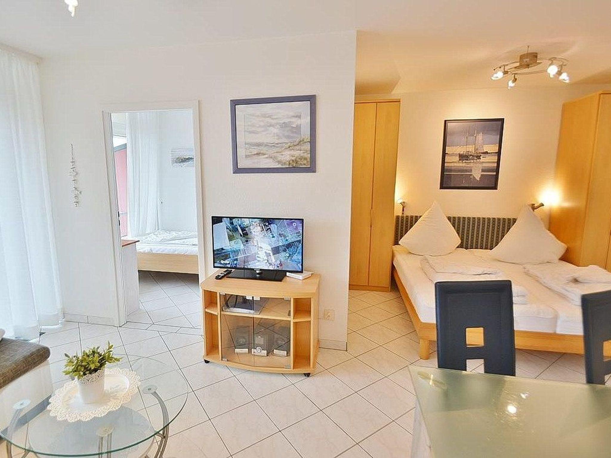 Modern eingerichtetes, freundliches Wohn- und Schlafzimmer mit Essplatz für 4 Personen. Das Wohn- und Schlafzimmer ist mit einem Doppelbett(180x200cm), zwei Kleiderschränken, einer Couch, einem Couchtisch und einem Phonowagen ausgestattet. Dieser verfügt über einen neuen Fernseher und eine Microanlage mit CD-Player und Radio. Vom Wohnbereich besteht ein direkter Zugang zum Balkon. Das Wohn- und Schlafzimmer ist mit hellen Fliesen ausgelegt. Das Fenster und die Balkontür verfügen über helle, blickdichte Vorhänge.