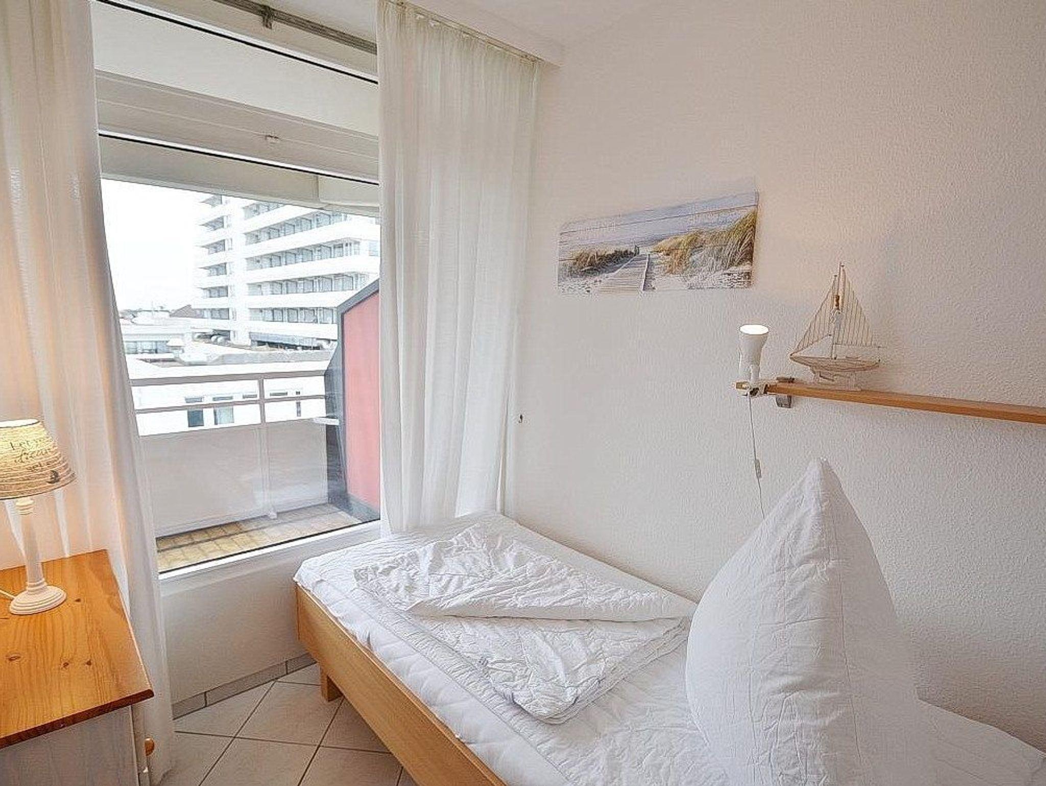 Separates, freundliches, helles Zimmer mit 2 getrennten Betten (90x190cm) und einer Kommode. Das Kinderzimmer ist ebenfalls hell gefliest. Helle, blickdichte Vorhänge bieten Sichtschutz am Fenster zum Balkon.