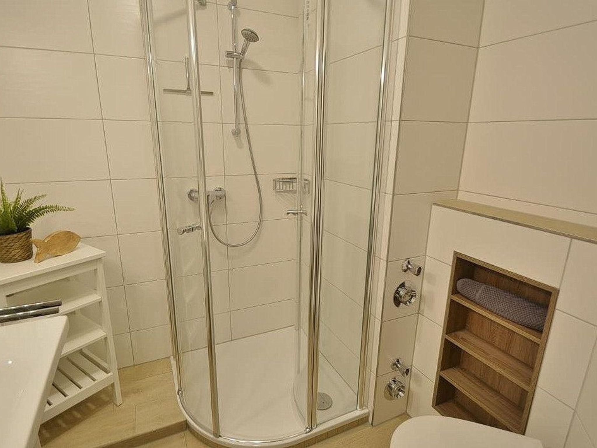 Modernes, 2018 komplett renoviertes, hell gefliestes Bad mit Dusche, WC, Waschtisch und ausreichend Ablagen.