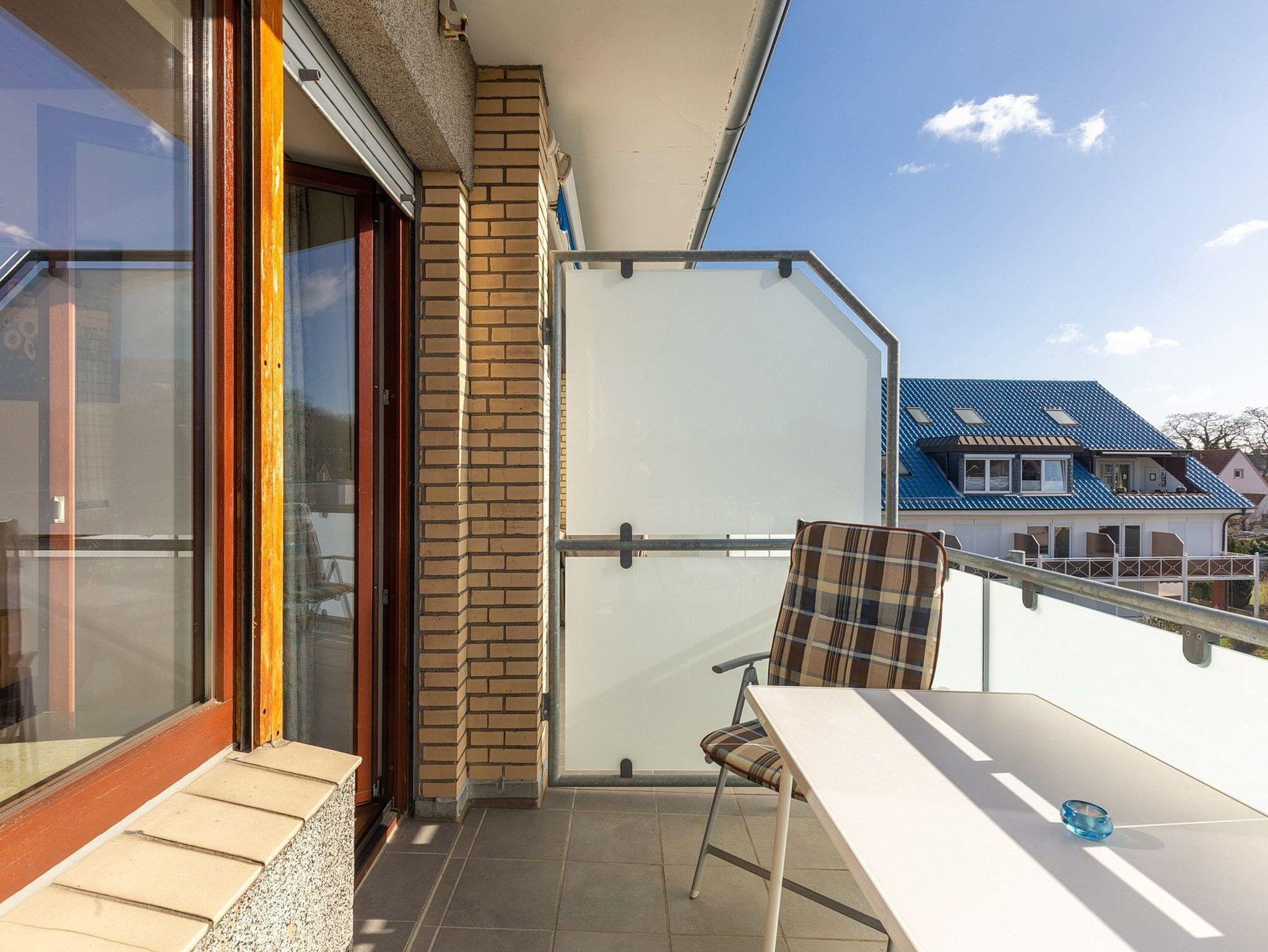Balkon mit Markise in südliche Richtung mit Blick über die Dächer von Grömitz, PKW-Stellplatz vor dem Gebäude, Fahrrad-Ständer vor dem Gebäude. Ein Kinderhochstuhl steht kostenlos zur Verfügung.