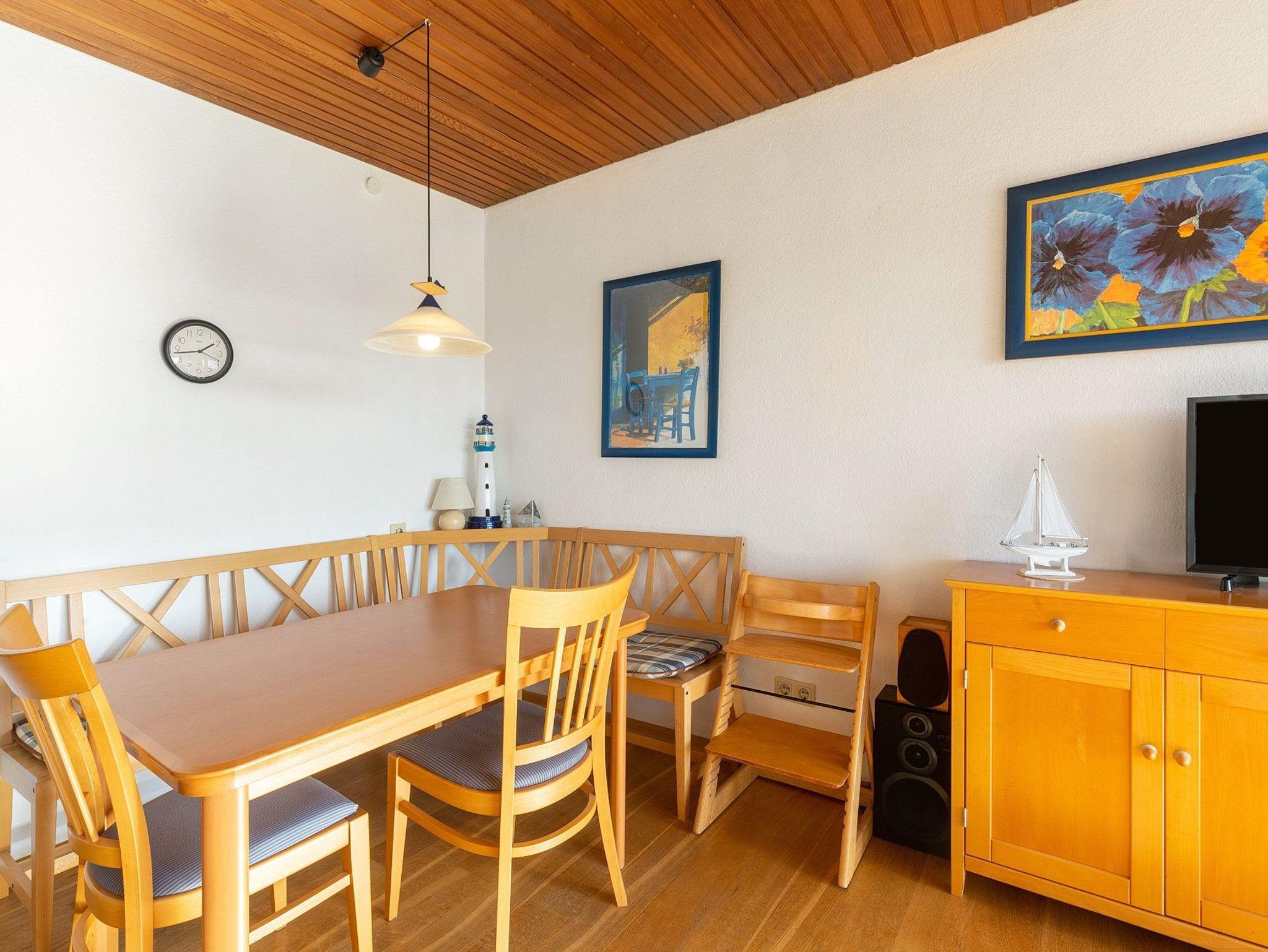 Freundliches Wohn- und Esszimmer mit direktem Zugang zum Balkon. Das Wohn- und Esszimmer ist mit einem Essplatz für 4 Personen, einer Kommode und 2 Couchen ausgestattet. Zur Unterhaltung stehen ein Fernseher und eine Mini-Stereoanlage mit CD-Player zur Verfügung. Das Wohn- und Esszimmer ist mit Parkett-Boden ausgelegt, das Fenster lässt sich durch ein Außenrollo vollständig verdunkeln.