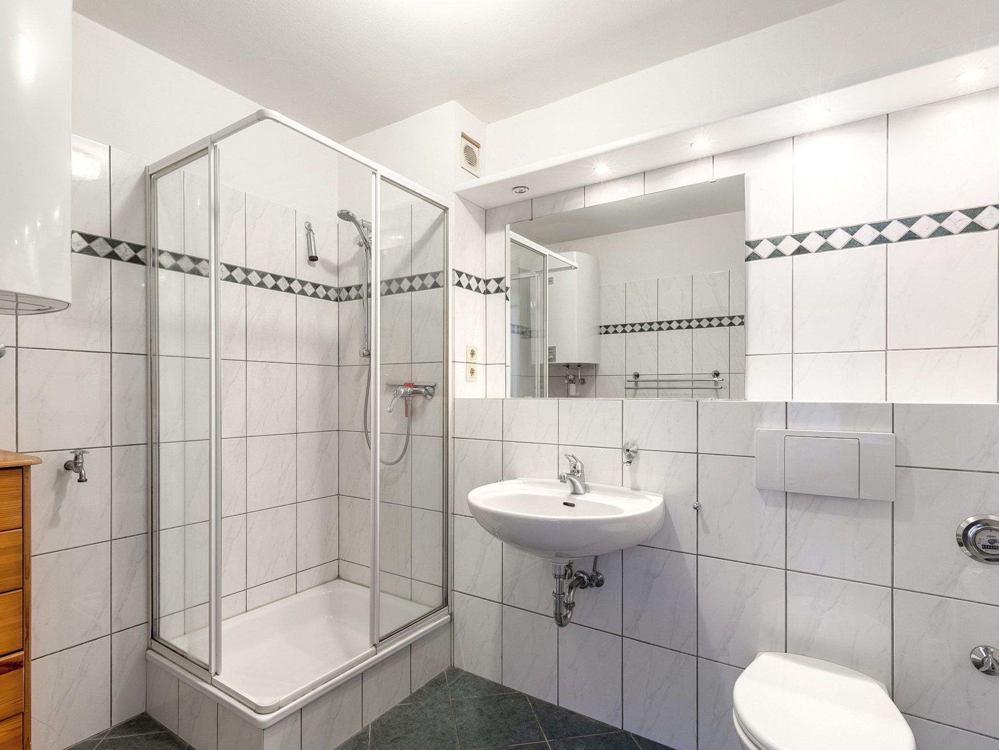 Modernes, freundliches, hell gefliestes Bad mit Dusche, WC und Waschbecken. Die Warmwasserversorgung erfolgt über einen Boiler.