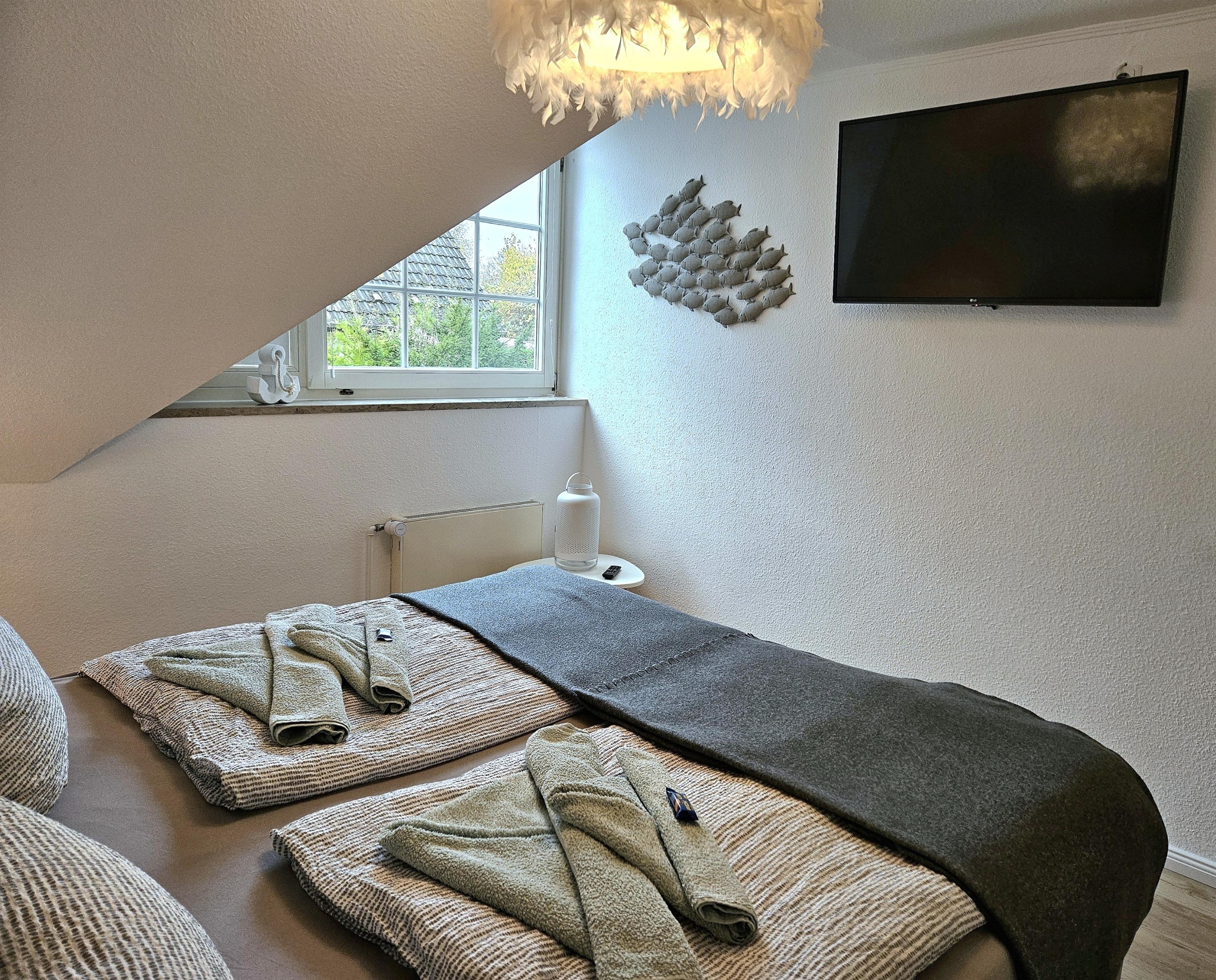 Das separate Schlafzimmer ist mit einem modernen Boxspringbett (180x200cm), einem Kleiderschrank sowie einem zweiten Smart-TV-Gerät (43 Zoll) ausgestattet. Verdunkelungs-Plissees sind hier vorhanden.