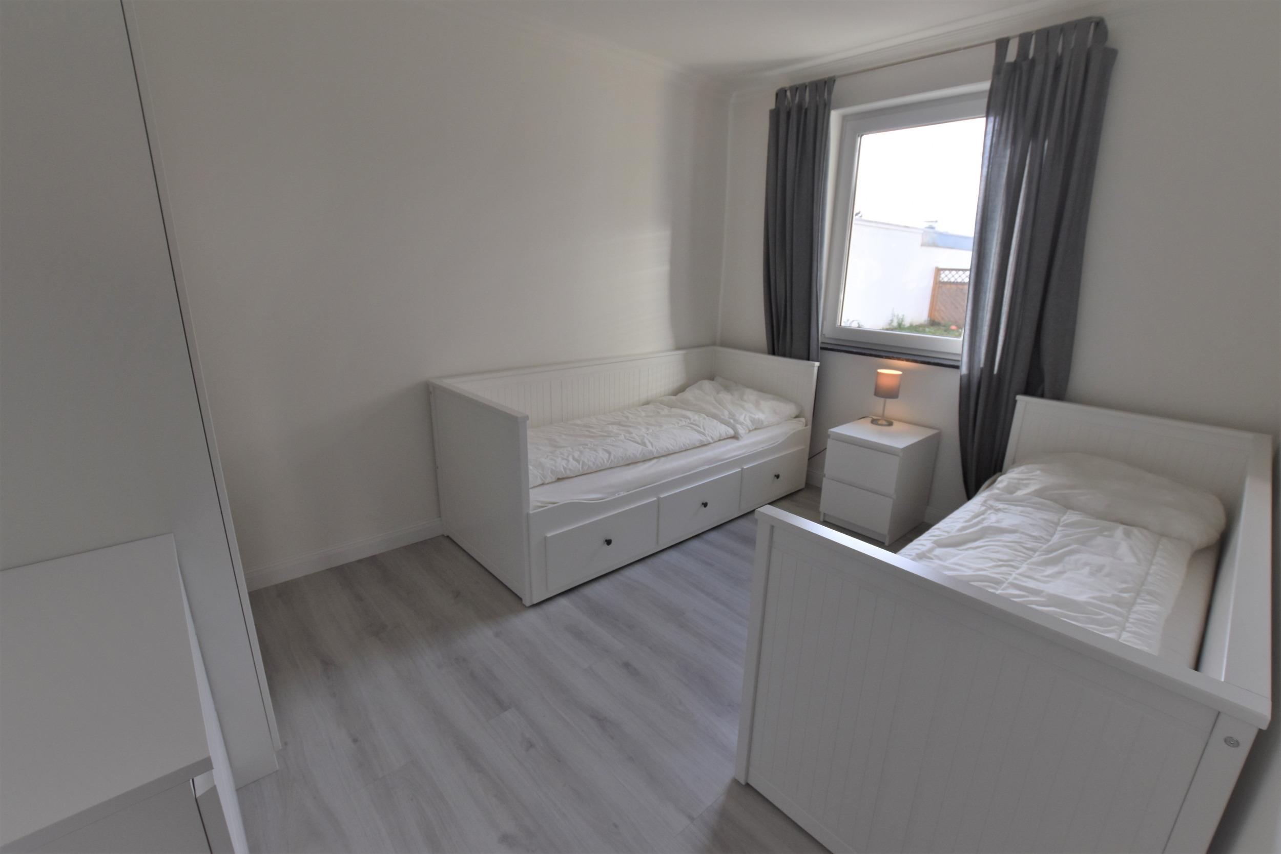Eingangsflur. Wohnzimmer mit gemütlichem Sofabereich und TV, Esstisch mit Stühlen, offene Küche mit Wasserkocher, Geschirrspüler, Backofen, Kaffeemaschine, Toaster, einen direkten Zugang zur Terrasse. Schlafzimmer 1 mit einem Doppelbett (1x 180 cm x 200 cm), TV, Kleiderschrank, Kommode und Rollladen. Schlafzimmer 2 mit zwei Einzelbetten(90x200 cm) , Kleiderschrank , Kommode und Rolladen. ein Duschbad mit bodentiefer Dusche, ein separates WC. W-LAN , ein PKW-Stellplatz vorm Haus