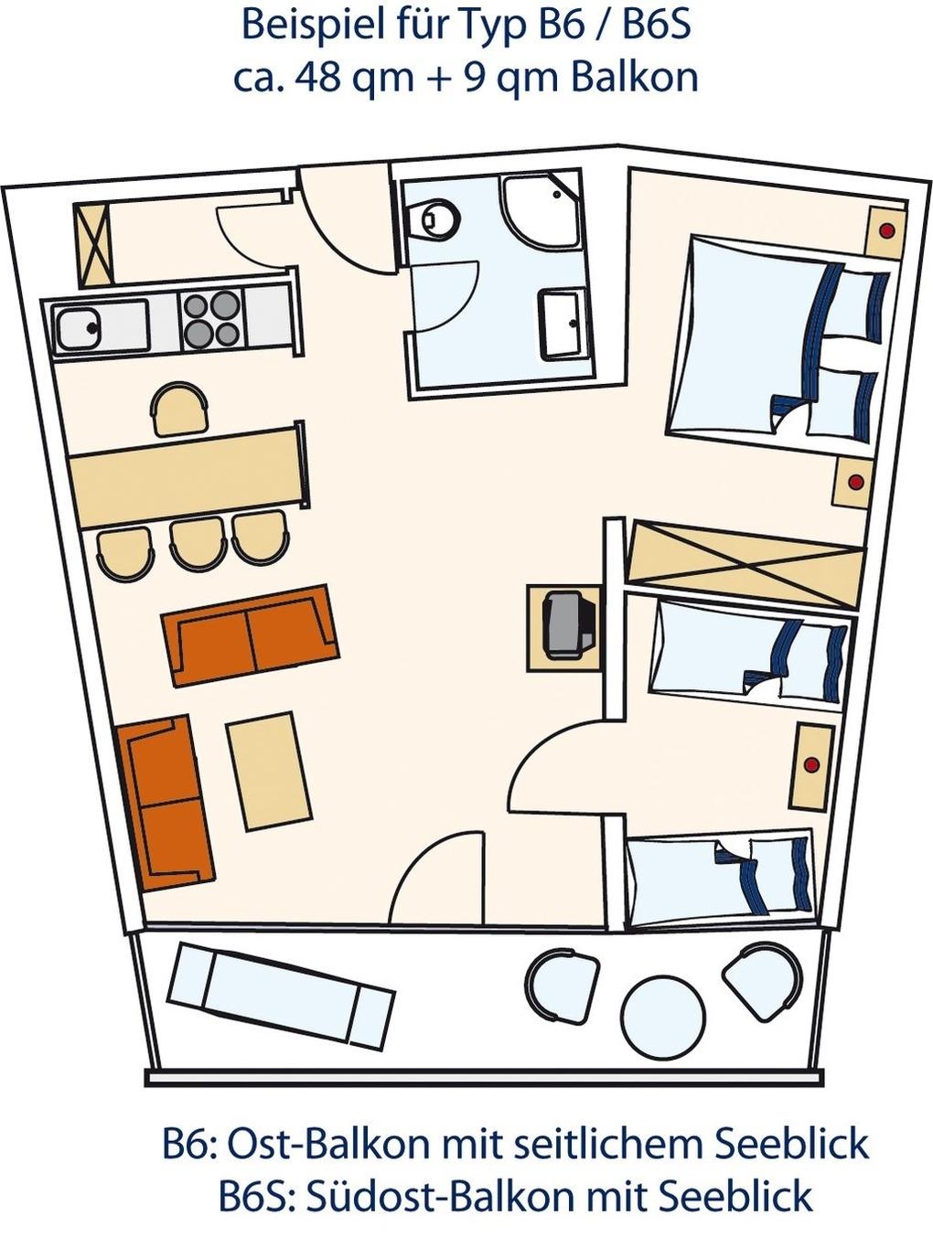 Dieses neugestaltete Nichtraucher Apartment vom Typ B6S liegt im 2. Geschoss. Die Wohnfläche beträgt 48 qm. Diese Wohnung ist für den Aufenthalt von 2 bis 4 Personen geeignet.