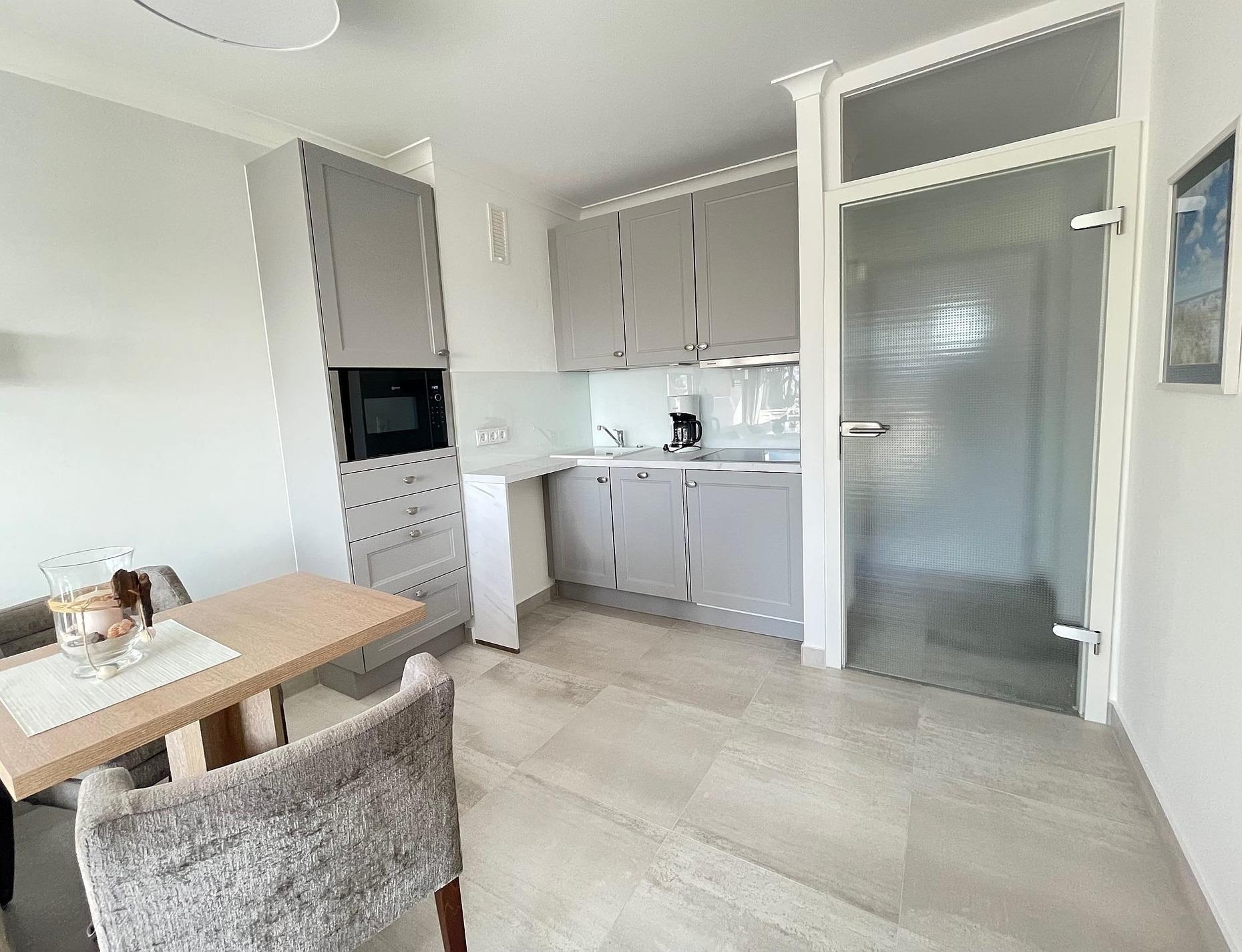 Die Küchenzeile sowie ein Esstisch mit drei Stühlen sind im Wohnraum integriert. Im Kühlschrank befindet sich ein kleines Gefrierfach. Vier Platten Ceranfeld, Mikrowelle sowie Geschirrspüler sind vorhanden.