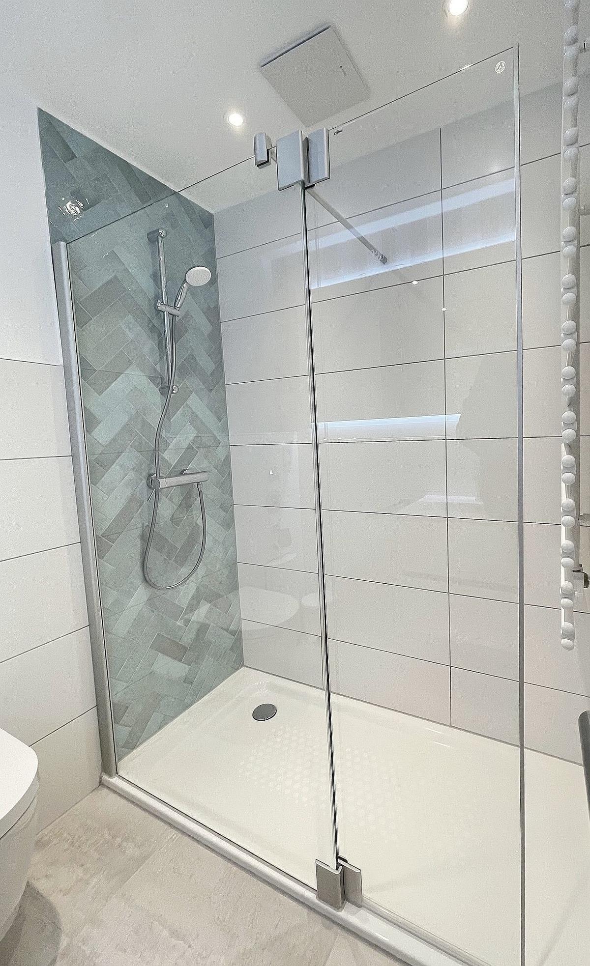 Das Bad kommt mit einer großen Dusche (0,80 x 1,60 m) mit ca. 4 cm hohem Einstieg, Waschtischanlage und WC ganz frisch daher.