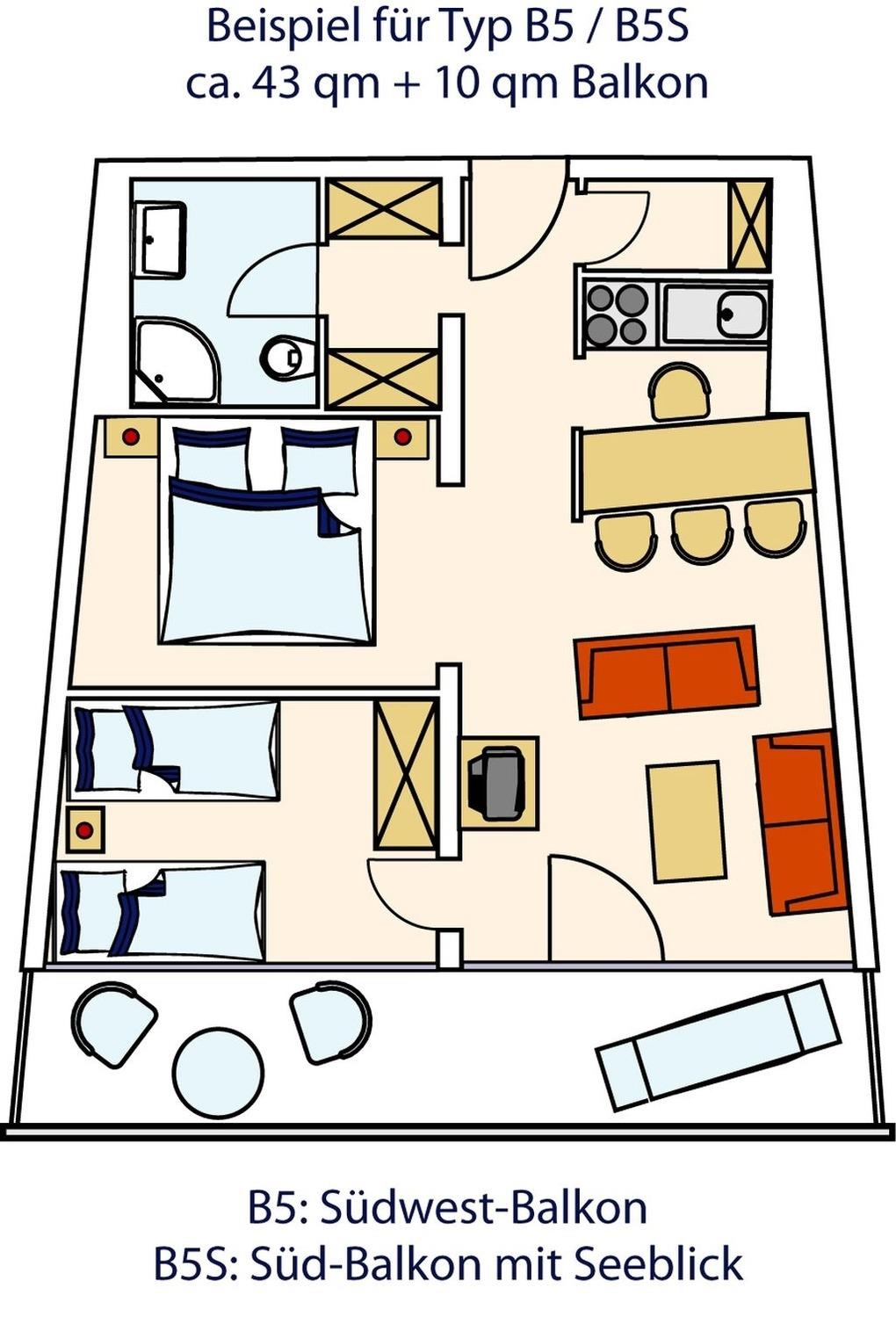 Diese Nichtraucher-Ferienwohnung vom Typ B5S liegt im obersten Geschoss. Die Wohnfläche beträgt 43 qm. Die Wohnung ist für einen Aufenthalt von bis zu 3 Personen geeignet.