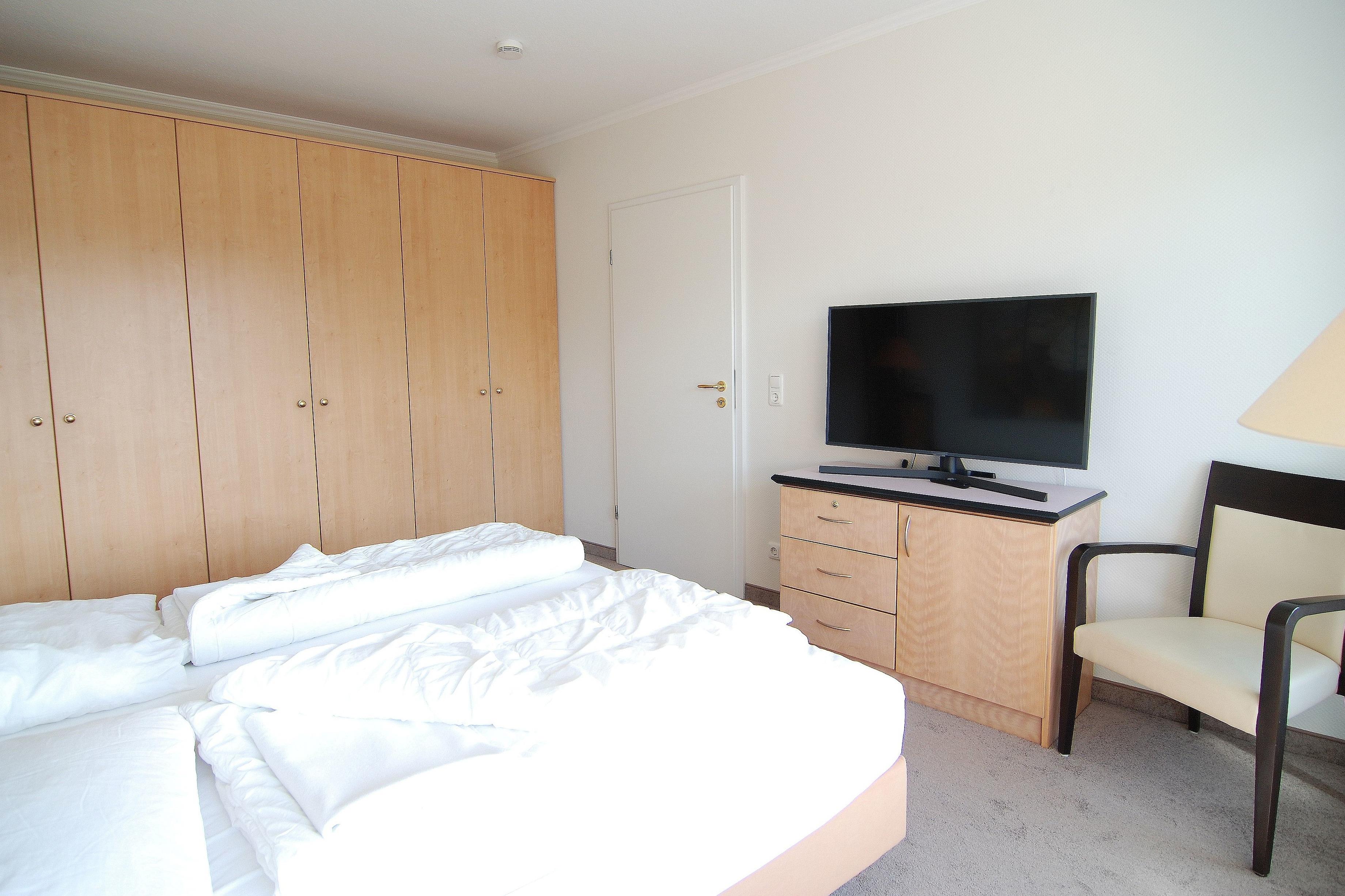 Die Wohnung verfügt über ein großzügiges Schlafzimmer mit Doppelbett, Kleiderschrank und zweitem TV.