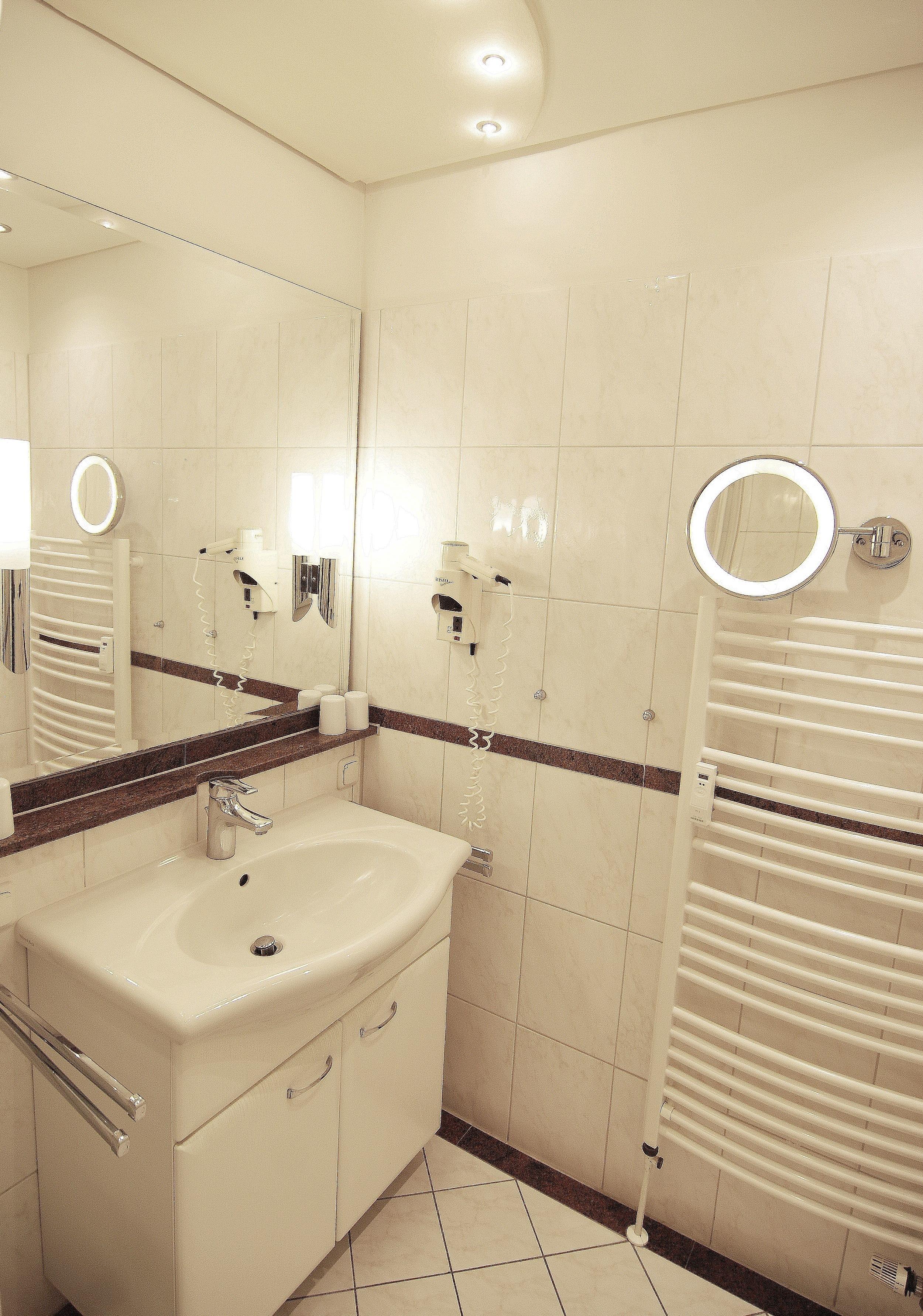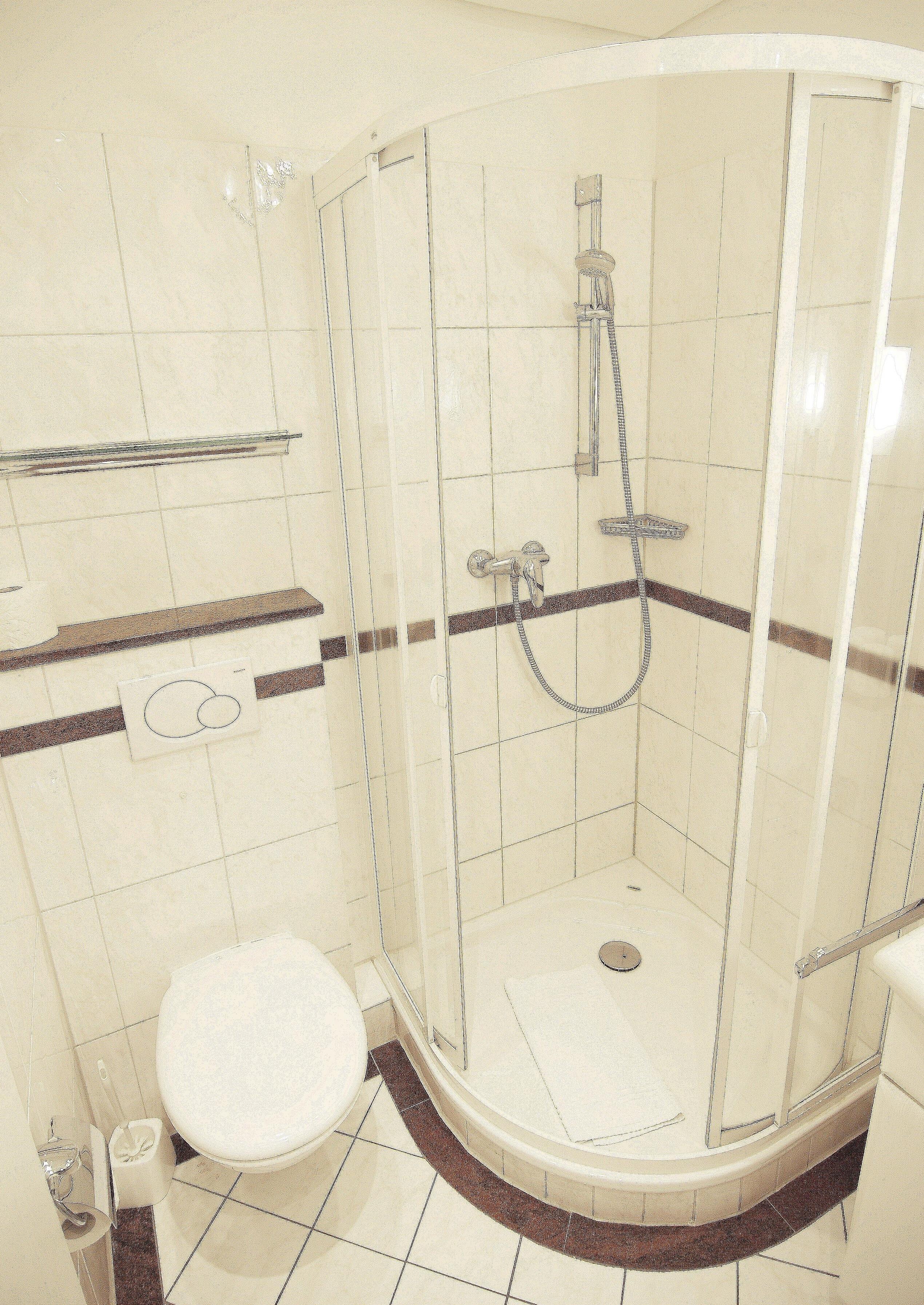 Die Dusche hat eine Einstiegshöhe von ca. 10 cm und WC.