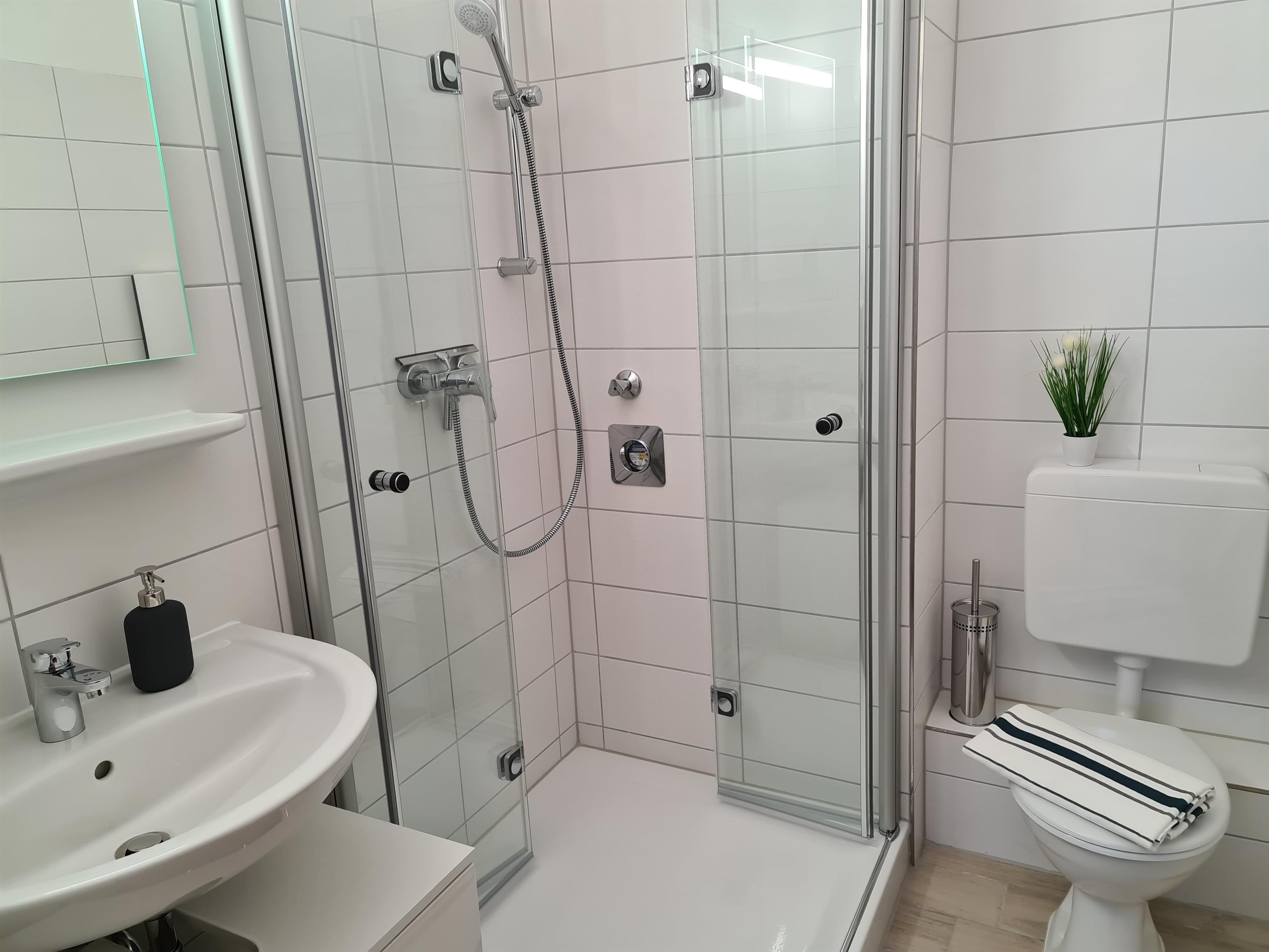 Das funktionelle Bad ist ausgestattet mit Dusche, WC und Haartrockner.