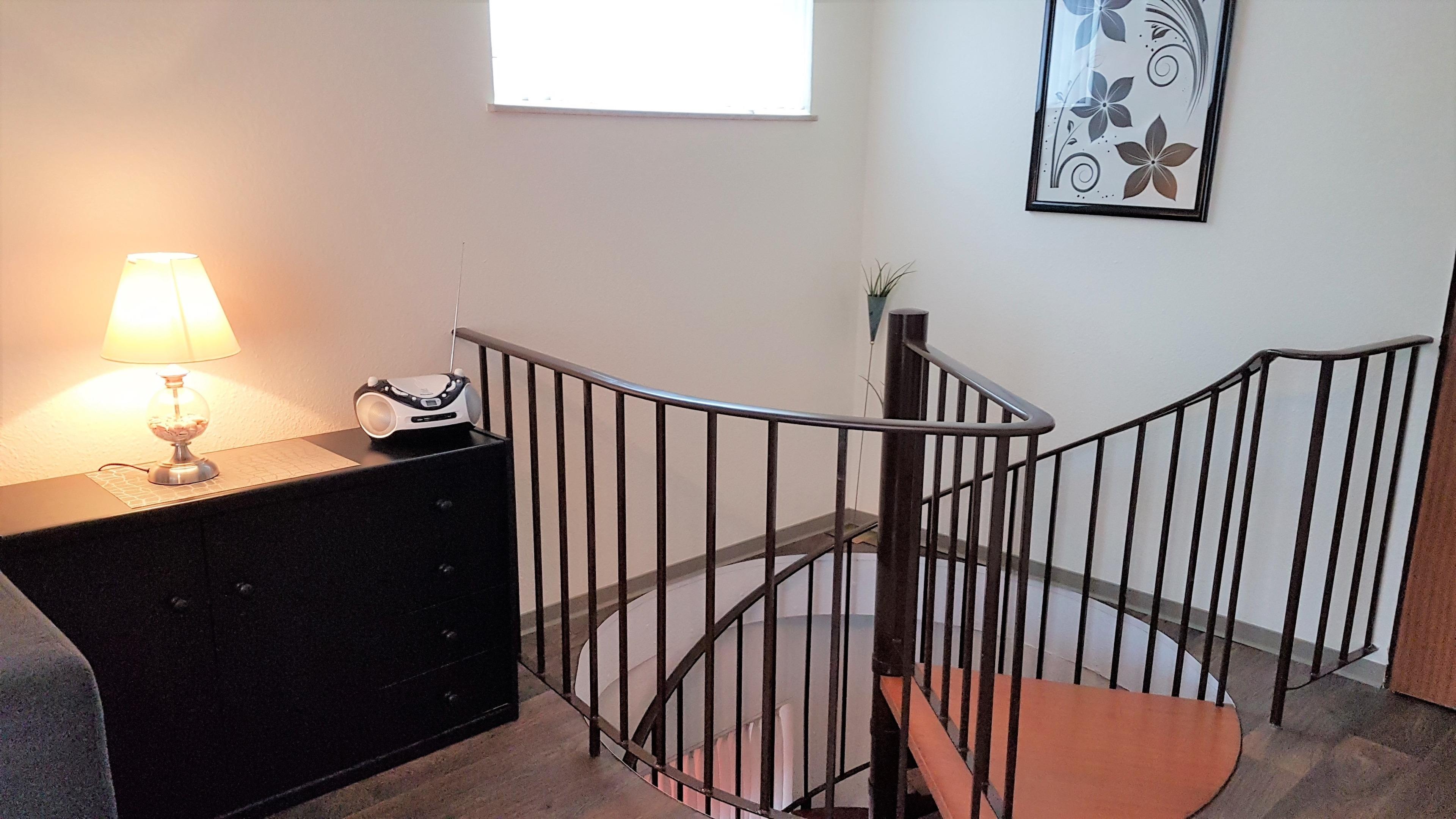 Die Ferienwohnung ist sehr geschmackvoll mit viel Liebe zum Detail eingerichtet. Die Eingangsbereiche befinden sich im Erdgeschoss sowie im 1. Stock. Somit haben Sie zwei komfortable Zugänge zur Wohnung. Im Erdgeschoss befindet sich das vollkommen neu renovierte Duschbad und das Schlafzimmer sowie eine eigene Terrasse. Von hier gelangen Sie über eine Wendeltreppe in den Wohnbereich mit Essecke und separater Küche sowie dem großzügigen Balkon mit Abstellraum. Im Wohnzimmer befindet sich eine Couchecke (Schlafsofa), ein Flatscreen-TV (SAT) und der Essbereich. Die vollausgestattete separate Küche verfügt über einen 4er-Kochplattenherd mit Backofen, Kühlschrank, Geschirrspüler sowie die üblichen Küchenutensilien.