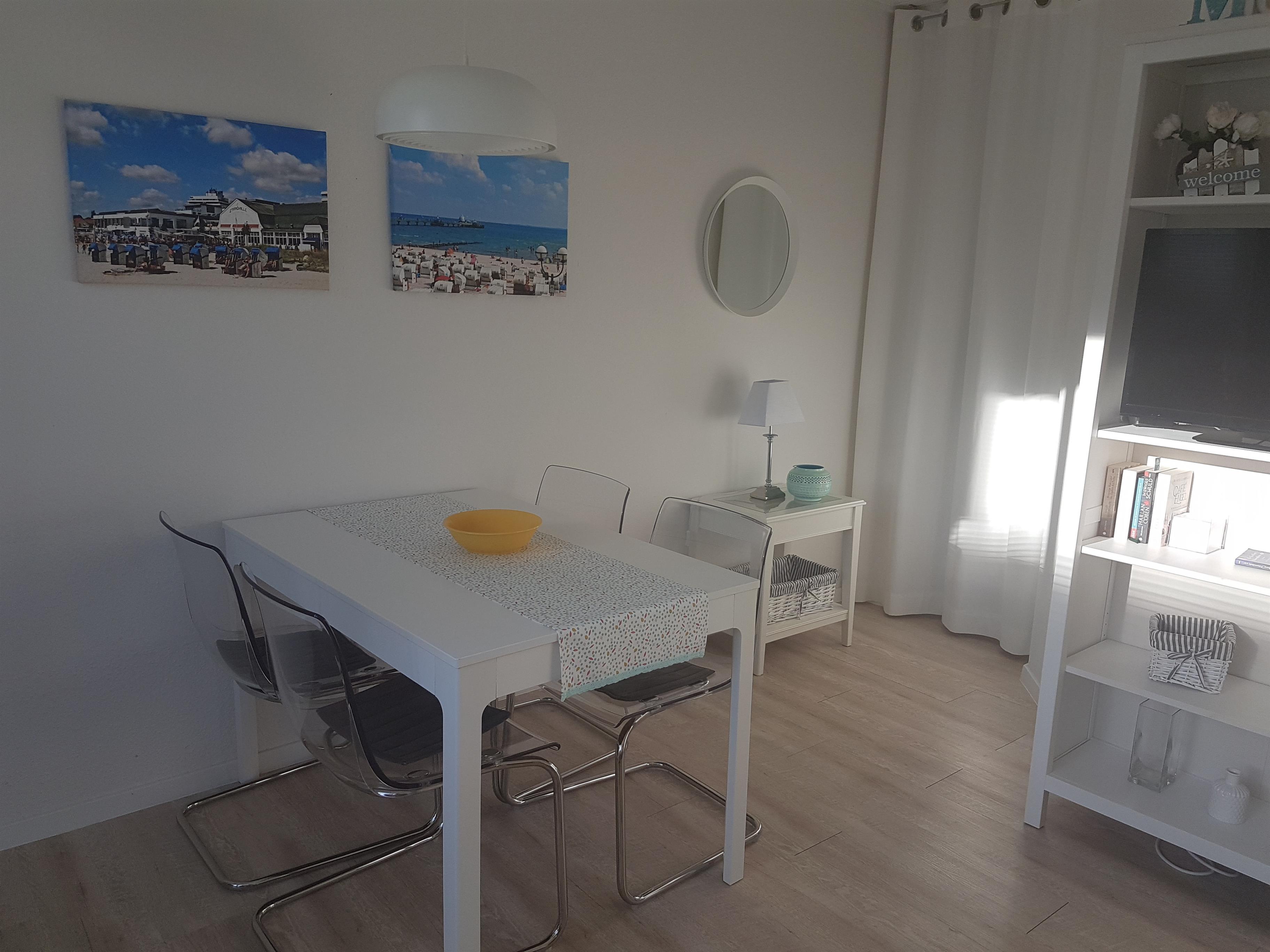 Die helle und moderne Wohnung hat neben dem Wohnzimmer ein separates Schlafzimmer mit Flachbild-TV und Einbauschrank. Im Wohnzimmer finden Sie eine gemütliche Schlafcouch. Somit ergeben sich Schlafplätze für 3 Personen. An der gemütlichen Essecke kann man nicht nur essen, es kann auch geklönt und gespielt werden. In der Küche ist vom Eierkocher, Toaster, Mikrowelle, TK- Fach mit Behältern, Backofen, Töpfen, Geschirr und Geschirrspüler alles vorhanden. Das helle Duschbad verfügt über WC, Dusche, Spiegelschrank und Haartrockner.