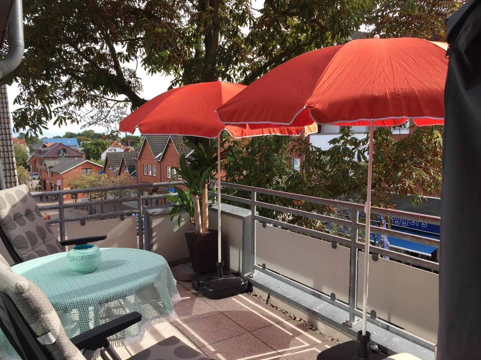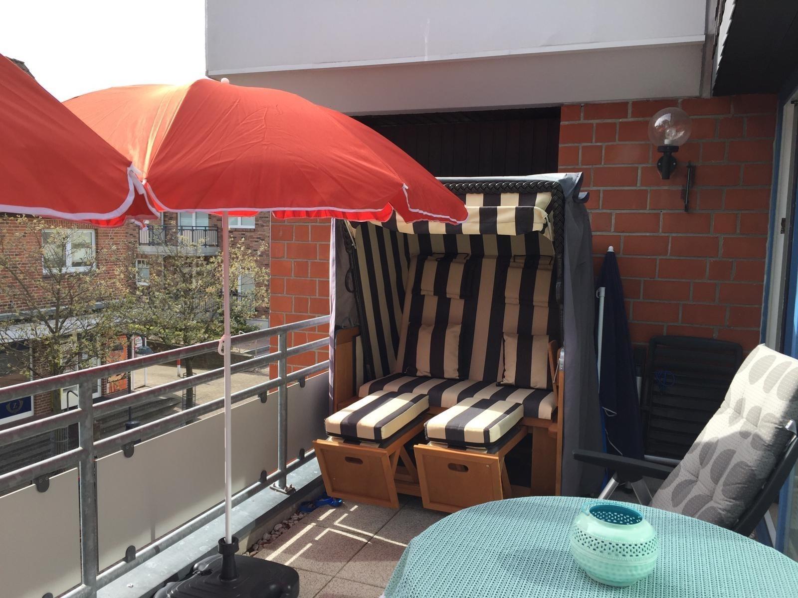Ein ca. 13 qm großer Balkon in Süd-Ost-Lage sorgt für Erholung in behaglicher Umgebung. Hier genießen Sie Ihr Glas Wein auf bequemen Balkonstühlen oder im Strandkorb; zwei Sonnenschirme spenden Schatten. Ein kostenfreier W-LAN Anschluss gehört zu Ihrer Wohnung dazu. Ein schöner Strandkorb wartet nicht nur an der Unterkunft, sondern auch direkt am Strand auf Sie.