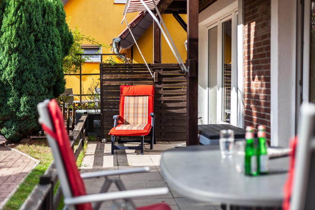 Eine komfortable Terrasse mit ausreichenden Sitz- und Liegemöglichkeiten laden zum Morgenkaffee, zum windgeschützten Mittagsschläfchen oder zum gemütlichen Grillabend ein.