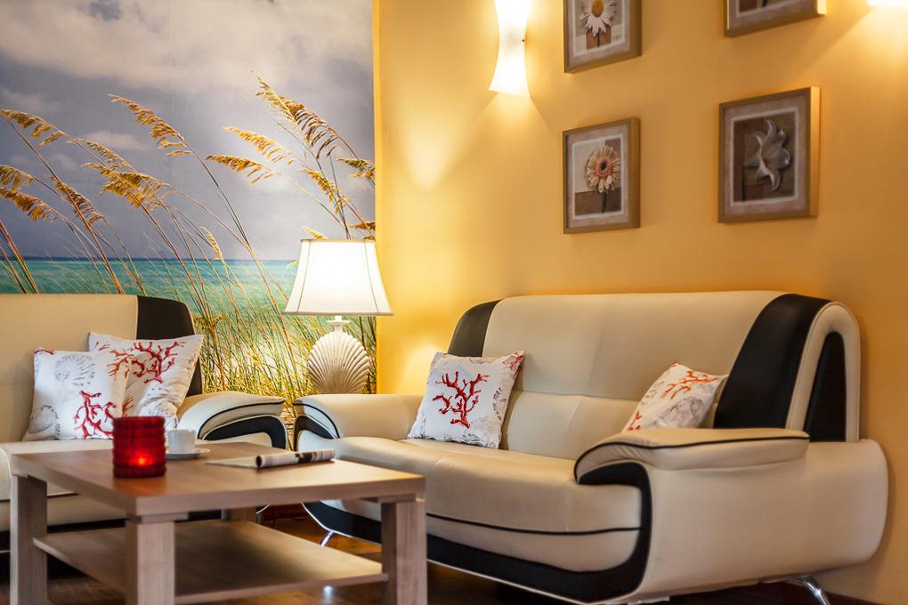 Im großen Wohnzimmer finden Sie eine gemütliche Leder-Couchgarnitur. Hier finden Sie außerdem einen Medienbereich mit Sat-TV, Radio, Leseecke und natürlich einen Internetanschluss. WLAN ist im gesamten Objekt und im Außenbereich kostenlos für Sie nutzbar.