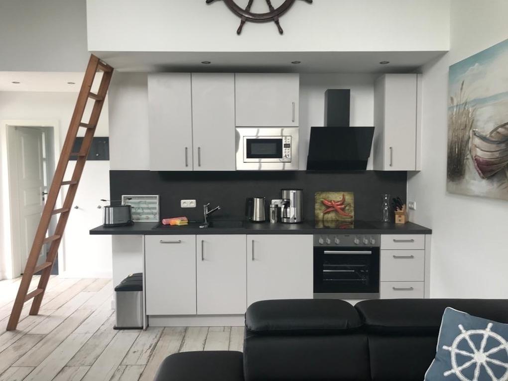 Im Erdgeschoss befindet sich das Schlafzimmer mit Boxspringbett und TV. Im Bad finden Sie eine Whirlwanne, Sauna, Dusche und ebenfalls einen TV. Der Wohn-Essbereich mit vollausgestatteter Küche ist bis zum Dach geöffnet und hat einen Schwedenofen. Über eine Raumspartreppe gelangen Sie in den Schlafboden, der mit 2 Einzelbetten eingerichtet ist.