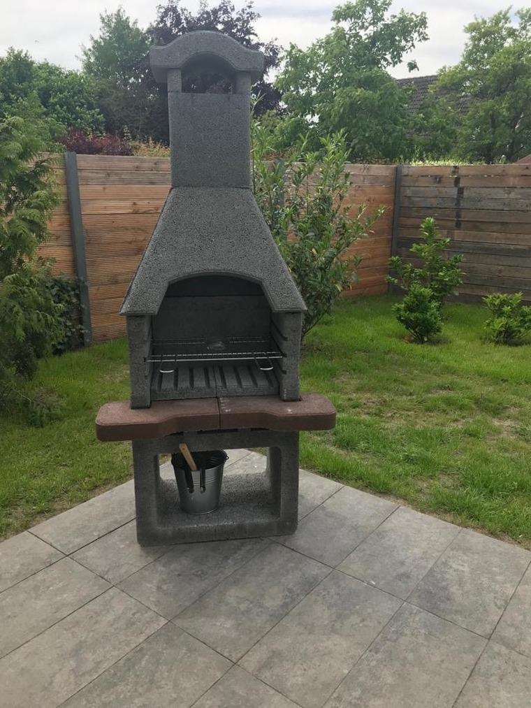 Der Garten ist komplett eingezäunt, hat einen Grillkamin, Terrassenmöbel und Sonnenliegen.