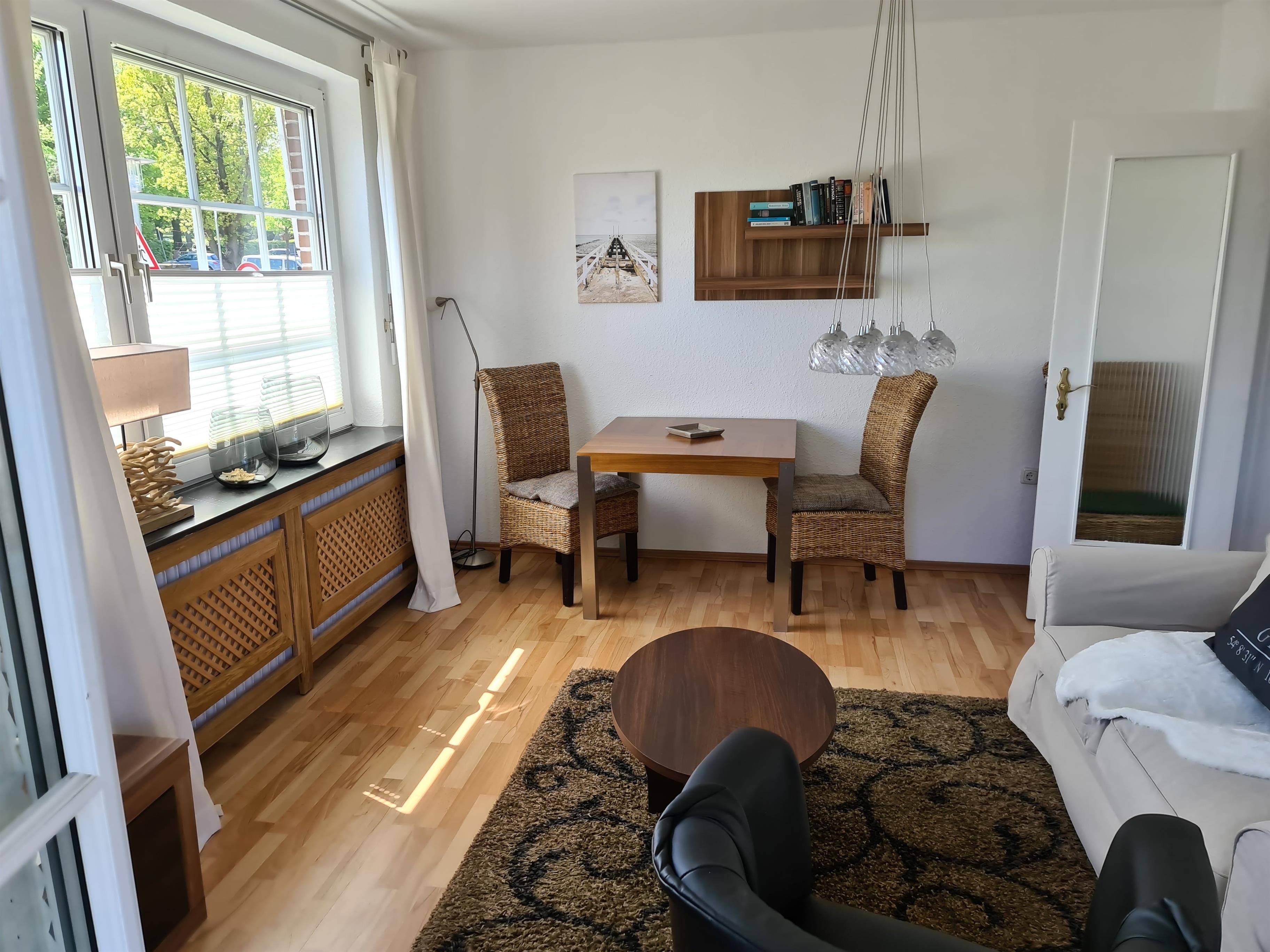 Ein Essbereich für 2 Personen steht für Sie im Wohnzimmer. Hier steht Ihnen neben einer gemütlichen Couch zum Verweilen auch ein Smart-TV zur Verfügung.
