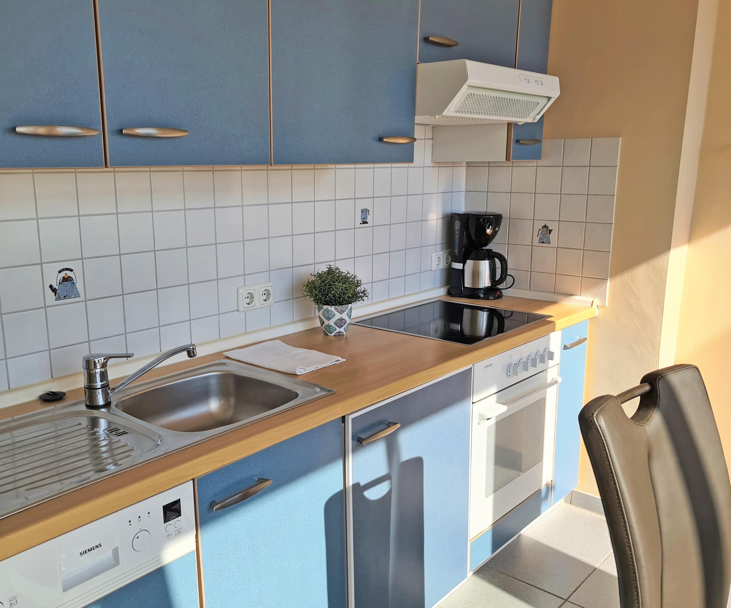 Die offene, moderne Einbauchküche ist mit allen üblichen Küchengeräten sehr gut ausgestattet. Angrenzend hieran befindet sich der Esstisch mit Platz für 4 Personen.